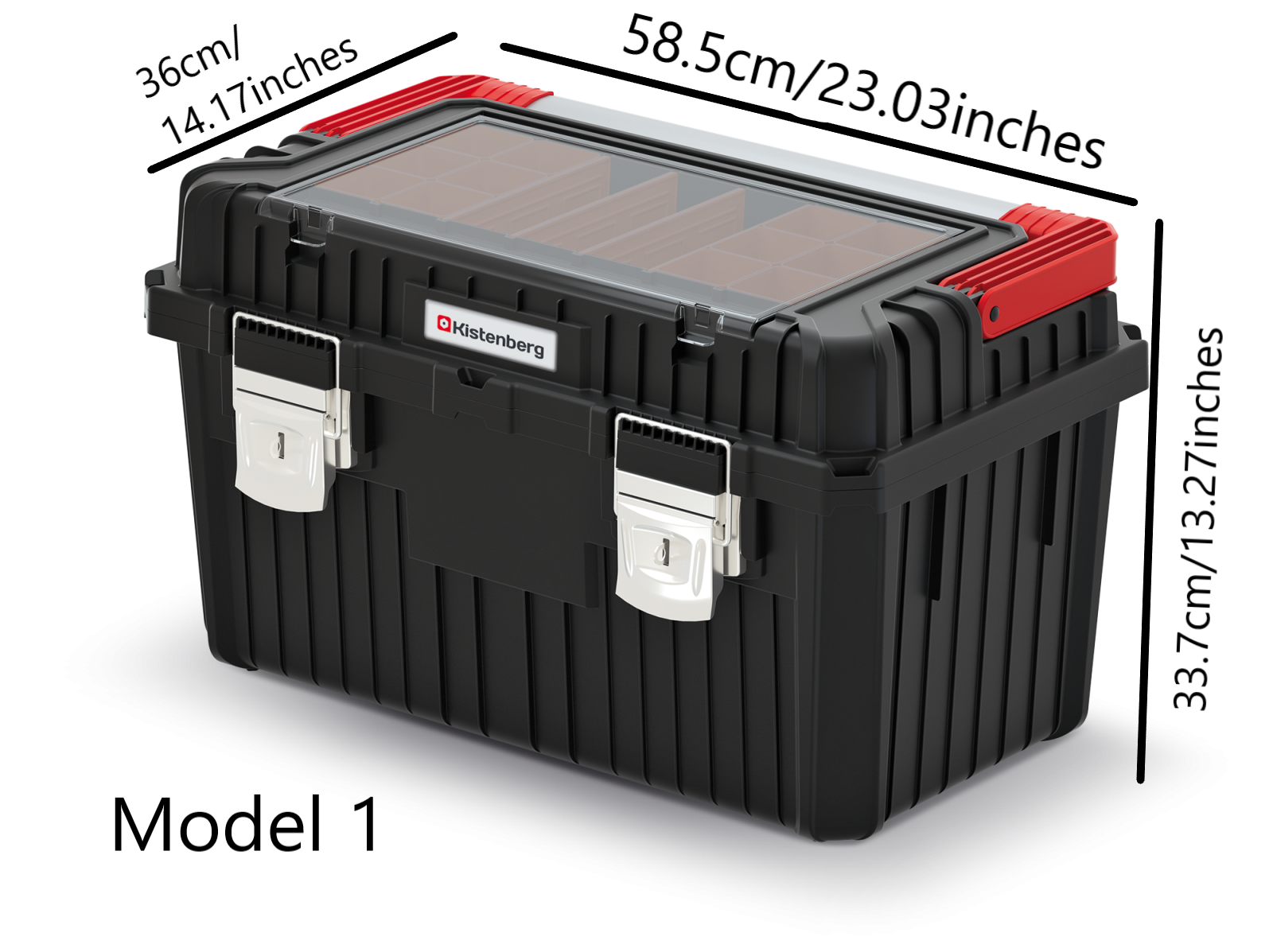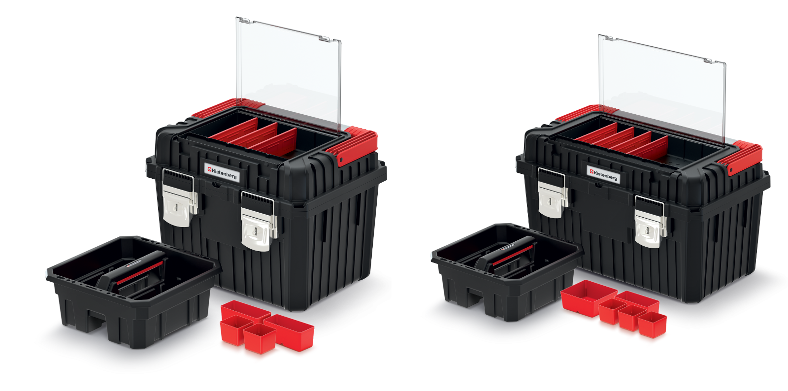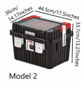 The integrated lid organiser with a transparent cover lets you see small parts at a glance without opening the main compartment, helping you work faster and stay tidier. Inside, a removable tray and adjustable separators allow you to divide tools and accessories into sensible sections.