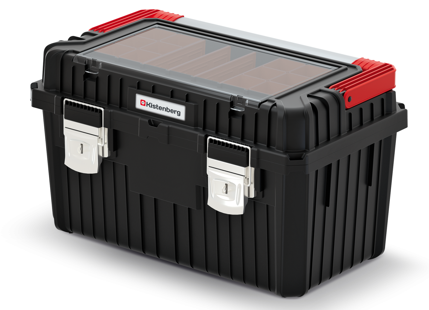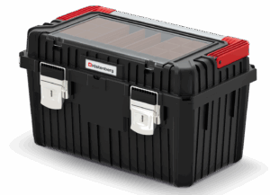 Designed for practical everyday use, the box combines a strong polymer body with metal fasteners and an aluminium carry handle for confident lifting and moving. Ribbed reinforcement improves durability, and a solid gasket helps keep out dust and splashes in demanding environments.