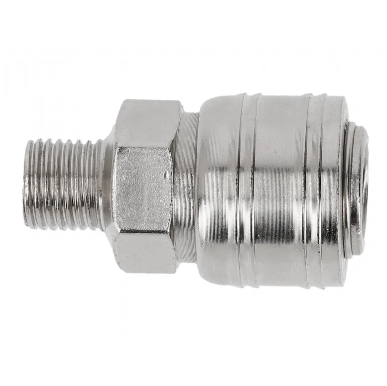 Male adaptor coupler for connecting pneumatic tools to an air supply line. Designed for a secure, reliable connection in workshop and garage setups. Suitable for systems using a 1/4″ fitting size.