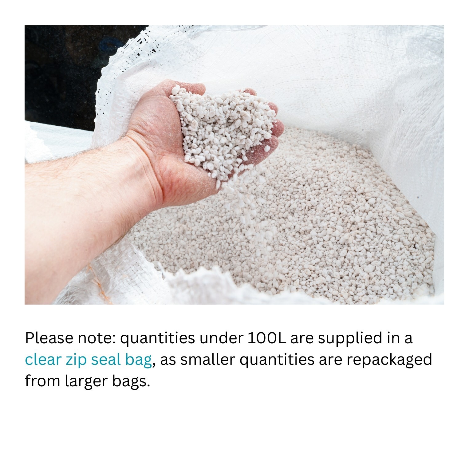 Bag sizes are available to suit small jobs through to larger growing setups. Smaller volumes are repacked from larger stock into clear, resealable bags; the largest size may be supplied in a plain bag.