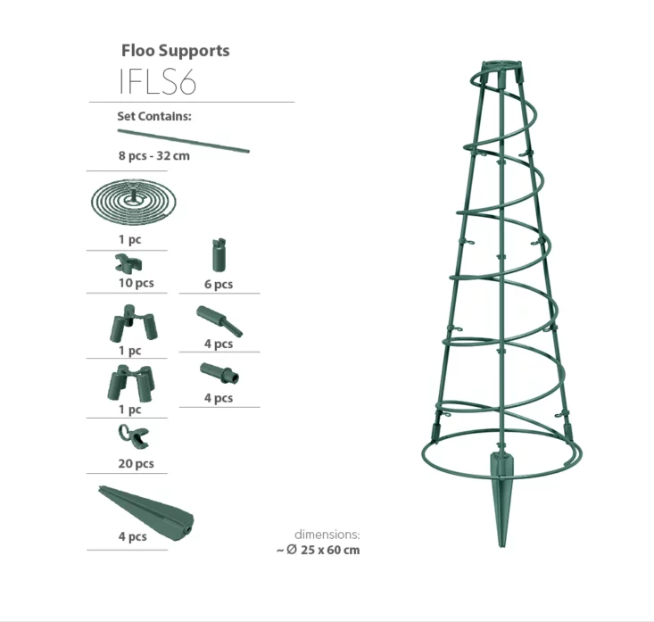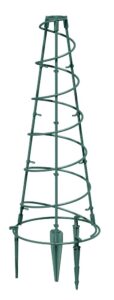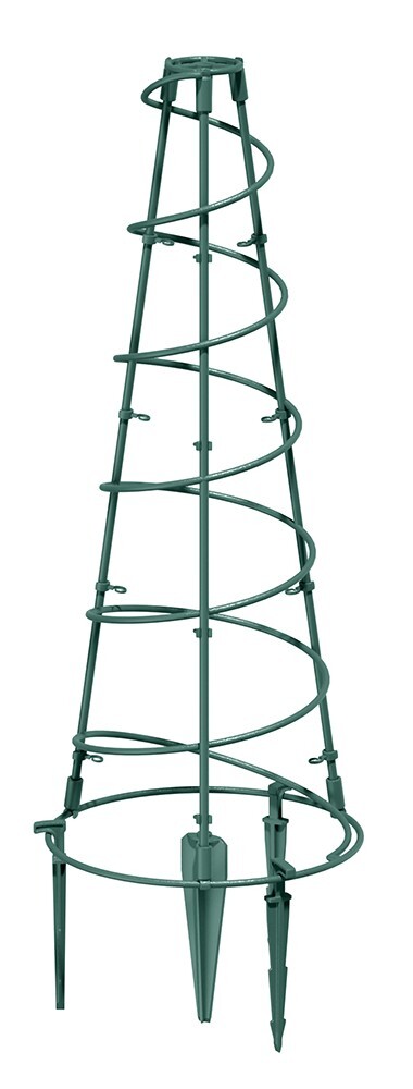 Made from lightweight plastic with a green finish, it blends into borders and containers while remaining easy to move and reposition. The design includes a spiral section that naturally guides stems as they climb, offering both support and a decorative look.