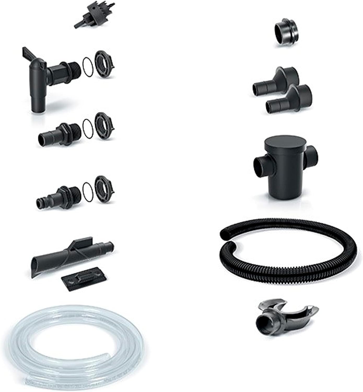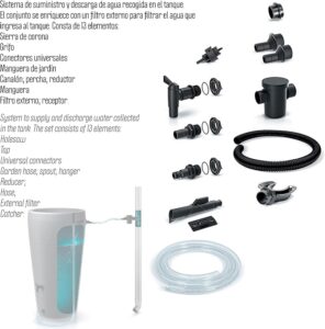 A complete connection kit is included to help link the tank to a downpipe and manage the incoming flow. The external filter helps reduce debris entering the tank, supporting cleaner stored water for routine watering tasks.