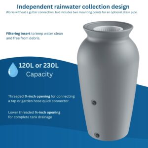 Collect and store rainwater in a decorative, freestanding water butt that doesn’t need a gutter connection. Made from tough, weatherproof HDPE with a debris-filter insert and threaded outlets for easy tap or hose connection. Connection kit included.