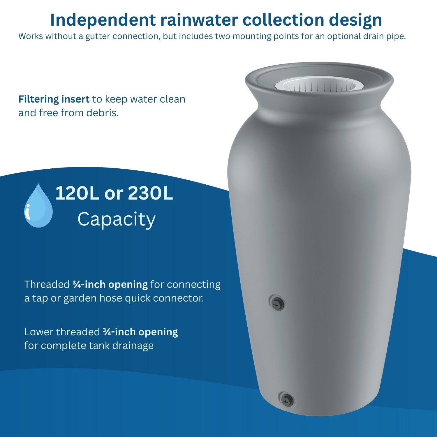 Made from durable HDPE, the tank is built for year-round outdoor conditions. The material is UV-resistant, frost-resistant and weatherproof, helping it keep its finish and strength over time. A filtering insert helps keep stored water cleaner by reducing leaves and other debris.