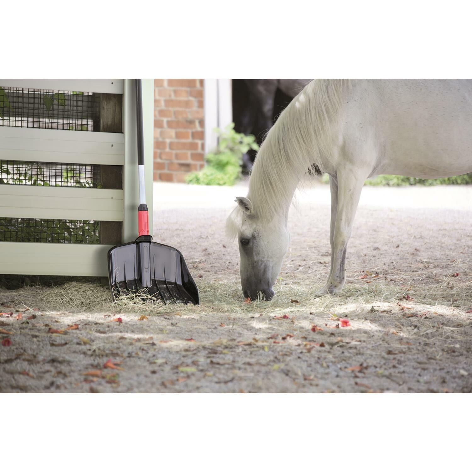 It’s a practical choice for day-to-day stable work, including laying out hay and collecting scattered bedding or feed. It also suits routine garden maintenance such as clearing leaves after mowing or tidying borders and paths.