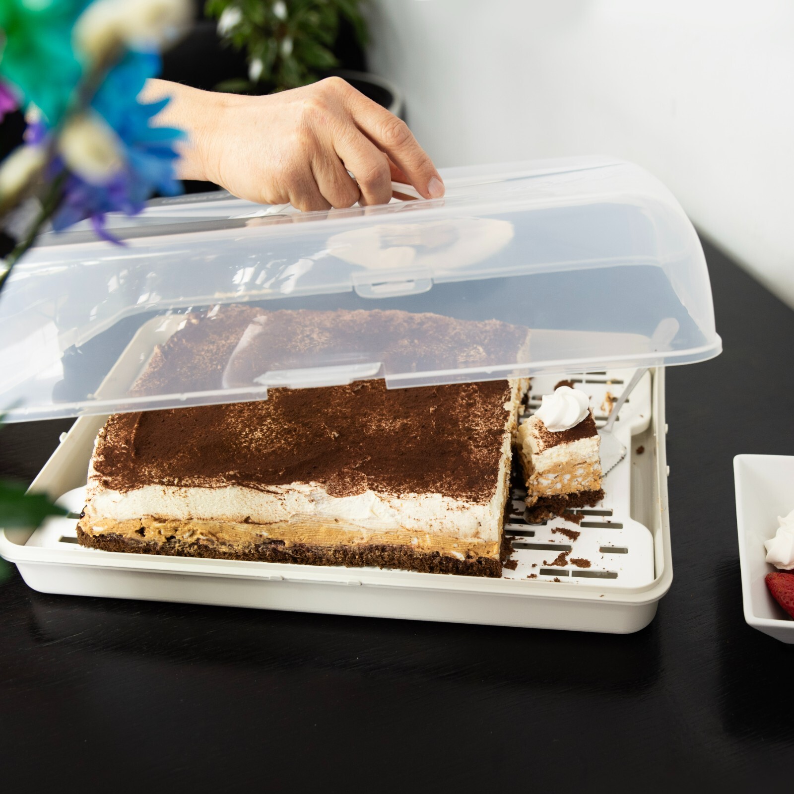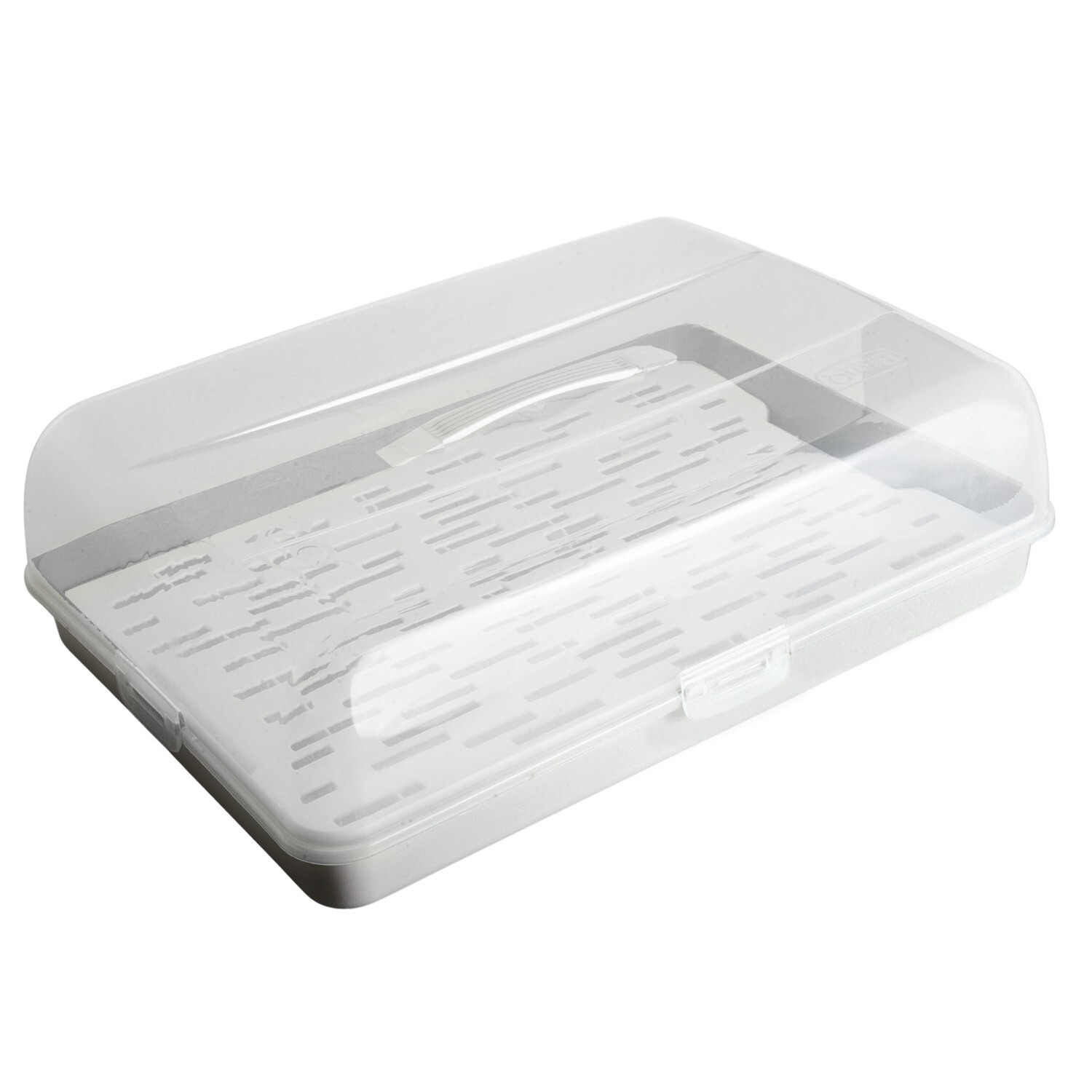 Keep cakes and cupcakes fresh and protected with this rectangular cake carrier, ideal for storage and transport. The clip-lock lid and carry handle make it easy to take bakes to parties, while the included cooling inserts help keep treats cooler on warm days.