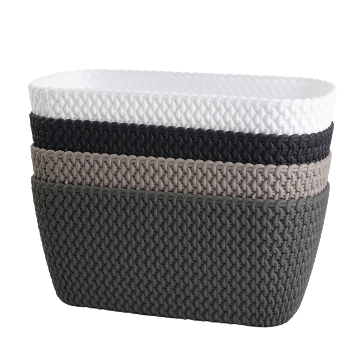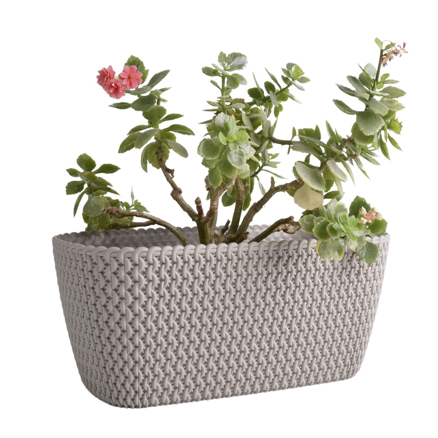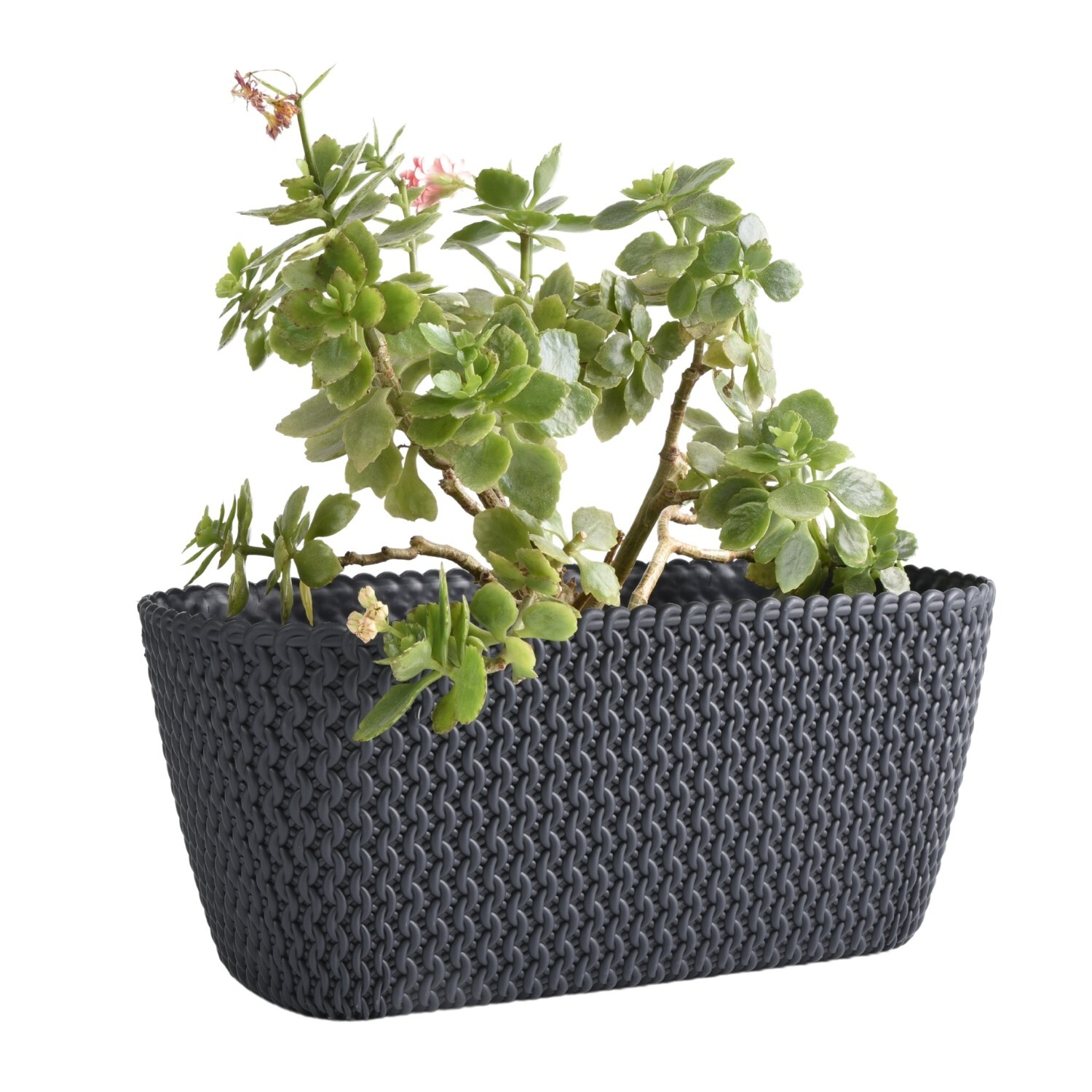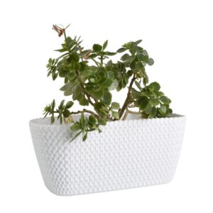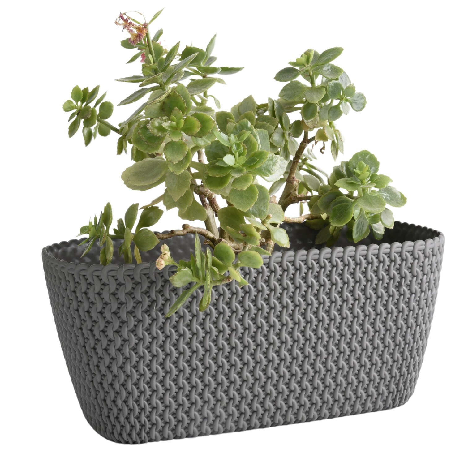 A stylish rectangular planter trough for indoor or outdoor use, ideal for herbs and larger plant displays on patios, balconies and terraces. Made from water-resistant plastic with a decorative knitted-effect texture for a tidy, modern look.