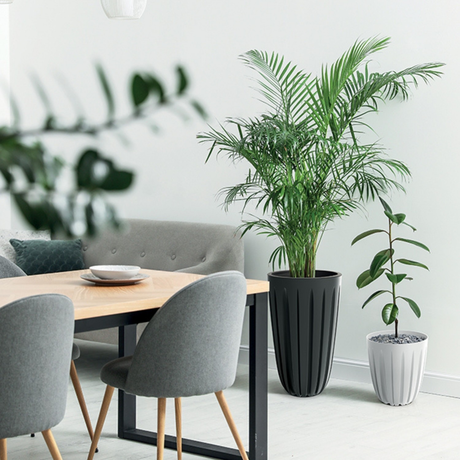 A stylish round planter with a grooved finish to showcase houseplants indoors or outside. Made from durable, lightweight plastic, it’s easy to move and simple to keep looking smart. Supplied with a practical insert for easier planting and care.