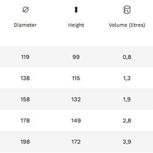 | Size | 0.8L ( W 119mm x H99mm), 1.3L ( W138mm x H 115mm), 1.9L (W158mm x H 132mm), 2.8L (W178mm x H149mm), 3.9L (W198mm x H 172mm) |