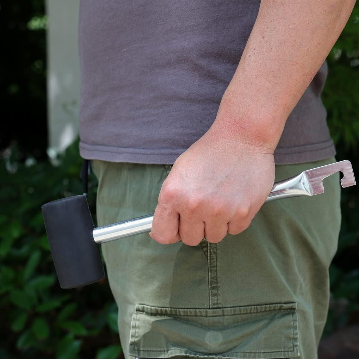 This 2-in-1 camping rubber mallet is designed for reliable pegging and quick pack-down, combining a cushioned striking face with an integrated peg puller hook. It helps you drive tent pegs and ground anchors securely while reducing vibration for more comfortable use.