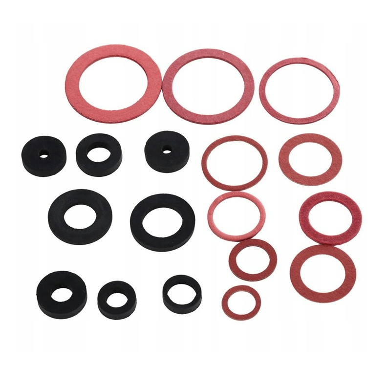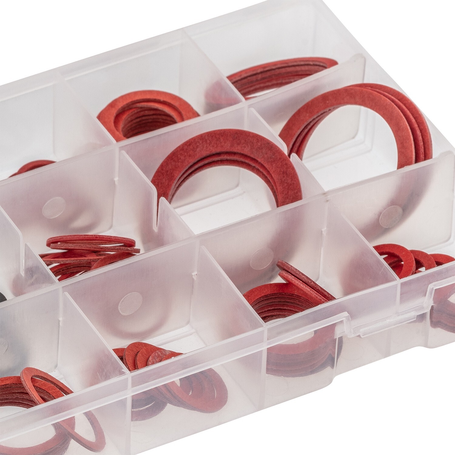 The set combines rubber and textolite (vulcanised fibre) washers for a practical mix of sealing options. Everything is supplied in a compartmented storage box so you can quickly identify and select the washer you need without rummaging through loose parts.