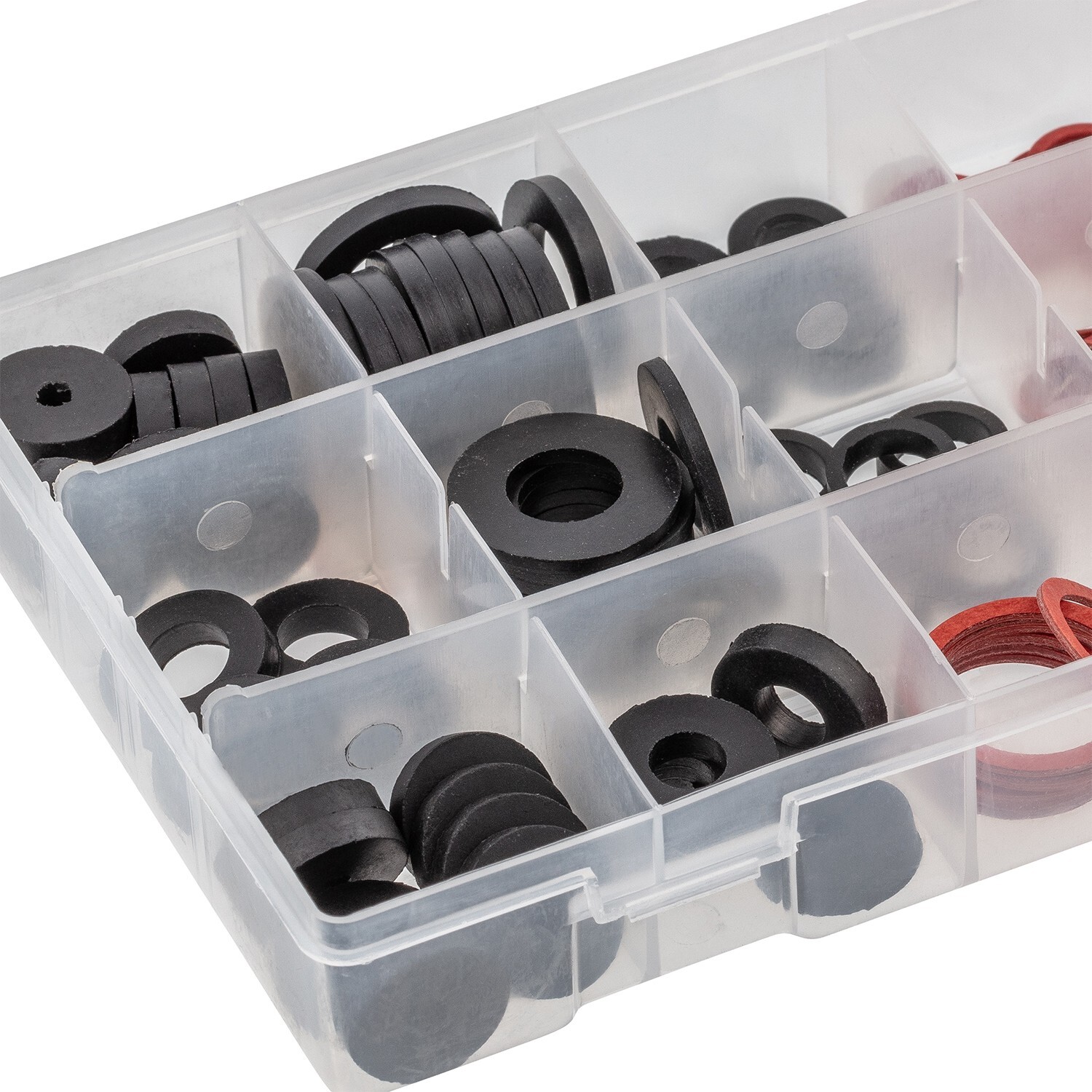 A handy 141-piece washer seal assortment for quick, reliable sealing on hot and cold water pipework. Includes rubber and textolite (vulcanised fibre) washers in 18 popular sizes, supplied in a compartmented organiser to keep everything easy to find.