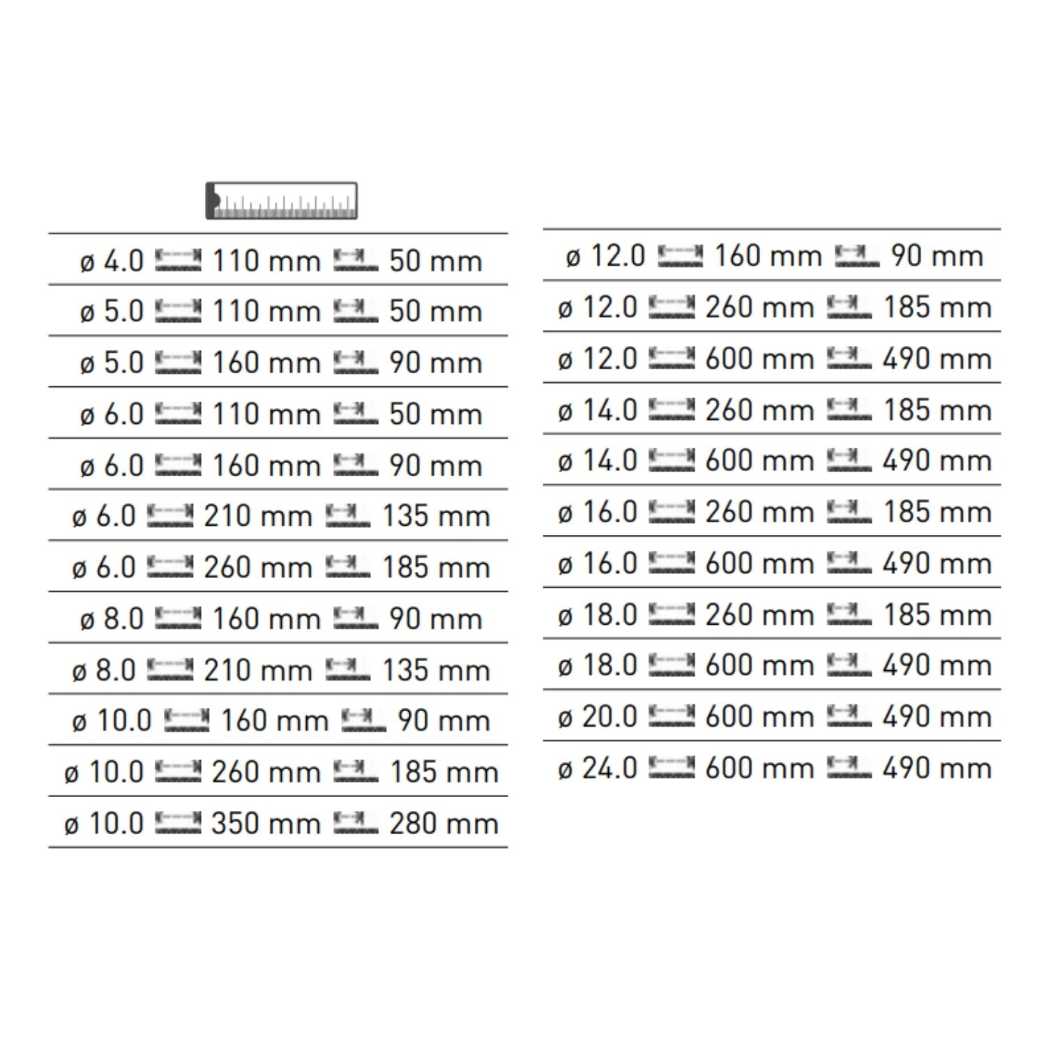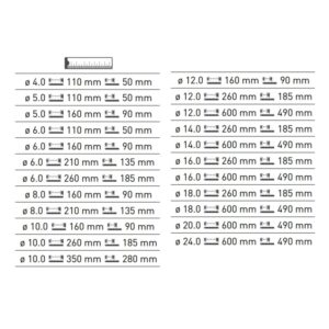 | Size | 5mm x 110 mm, 5mm x 160 mm, 6mm x 110 mm, 6mm x 160 mm, 6mm x 210mm, 6mm x 260mm, 8mm x 160mm, 8mm x 210mm, 10mm x 160mm, 10mm x 260 mm, 10mm x 350mm, 12mm x 260 mm, 12mm x 600mm, 14mm x 260mm, 14mm x 600mm, 16mm x 260 mm, 16mm x 600mm, 18mm x 260mm, 18mm x 600mm, 20mm x 600mm, 24mm x 600mm, 12x 160mm |