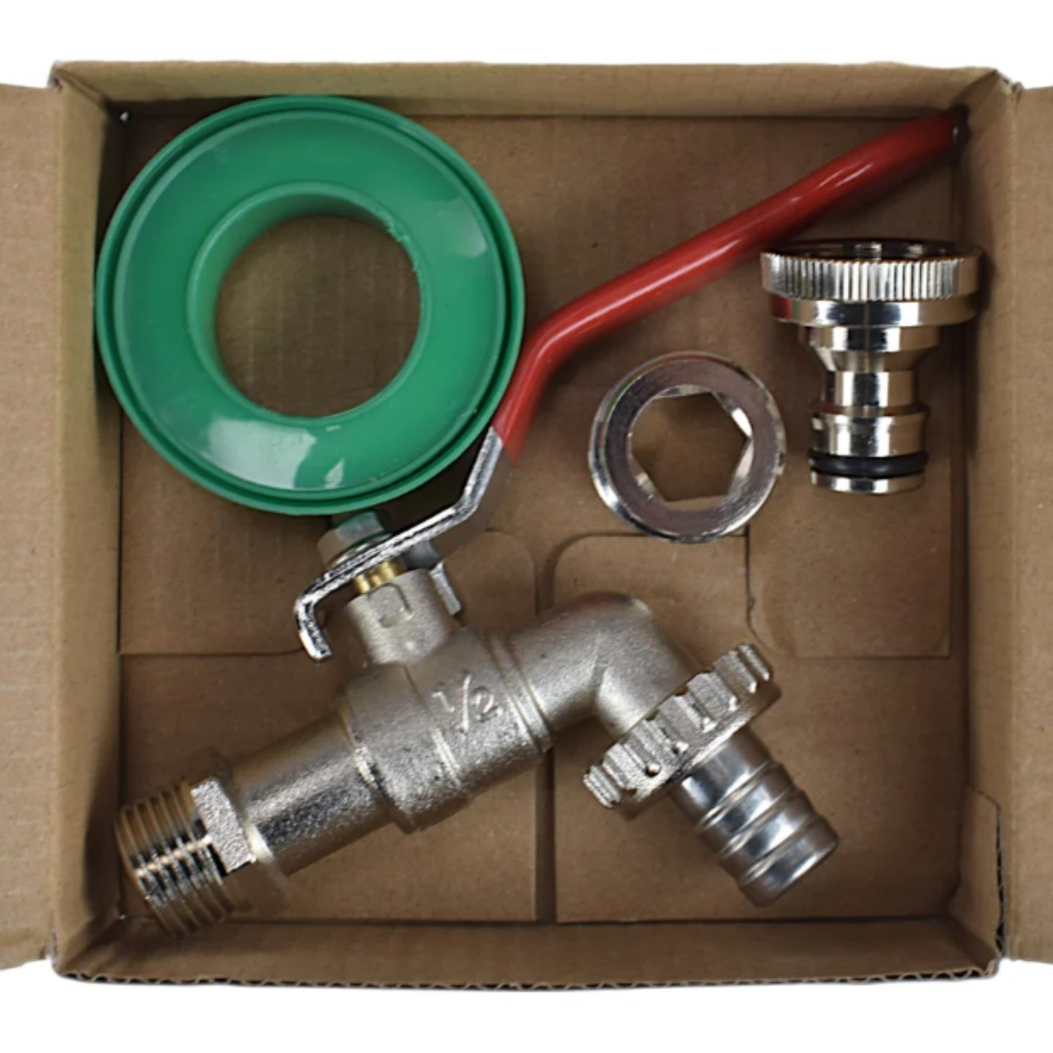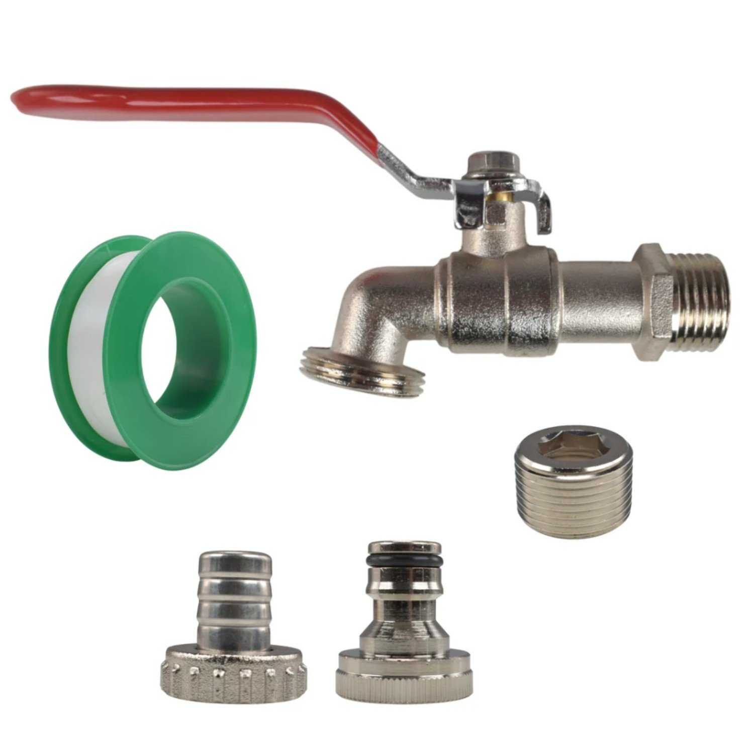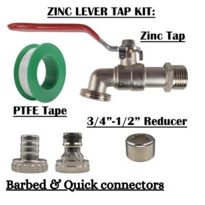 | Included in box | Lever tap, barbed outlet fitting, quick-connect outlet fitting, PTFE tape, 1/2" to 3/4" BSP conversion cap |