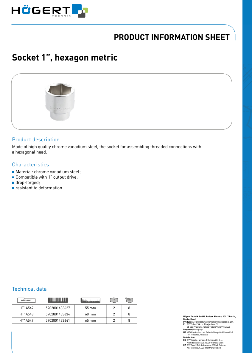 Tough 1in drive shallow hex socket for assembling and loosening hex-headed fasteners. Made from chrome vanadium steel for dependable strength and long service life in workshop and site use.