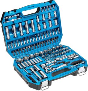 Ideal for general DIY, garage tasks and assembly work, the set includes standard and deep sockets, Torx (E) sockets, spark plug sockets, extension bars, universal joints and a driver handle. The included 5/16″ bits expand the range further, making the kit suitable for mixed fastening types without constantly changing tools.
