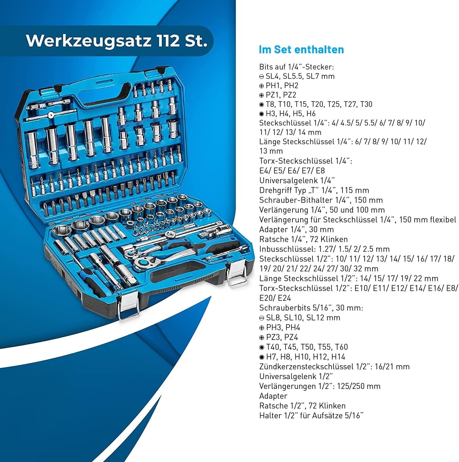Versatile 112-piece socket and bit set for everyday repairs and heavier workshop jobs. Includes 1/4″ and 1/2″ drive sockets, ratchets and extensions in a compact carry case for organised storage and easy transport.