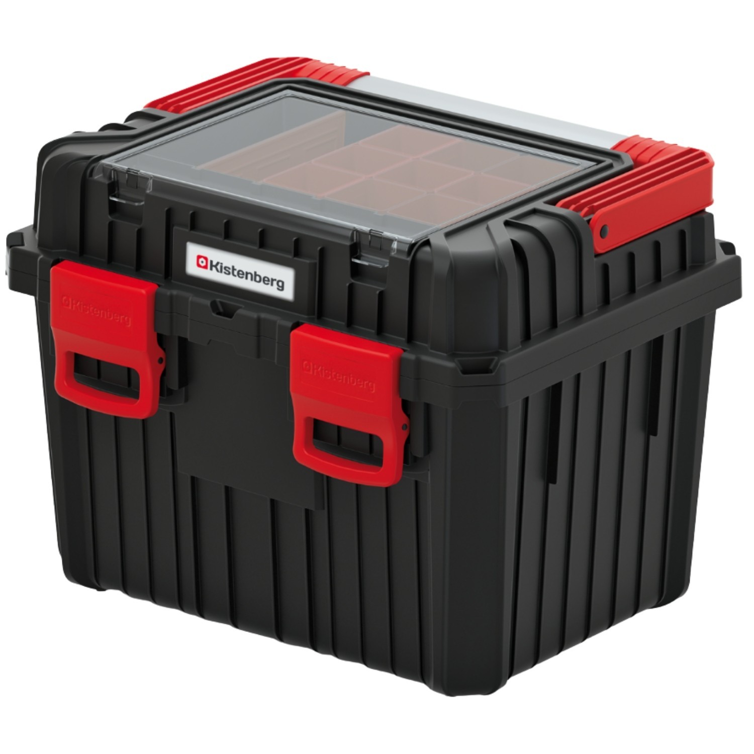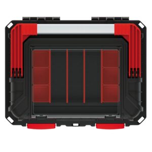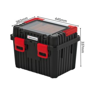 The body is made from a reinforced polymer blend for everyday toughness, with heavy-duty ABS latches to keep the lid firmly shut. A solid gasket helps resist dust, dirt and moisture, while the clear polycarbonate organiser cover lets you see small items at a glance.