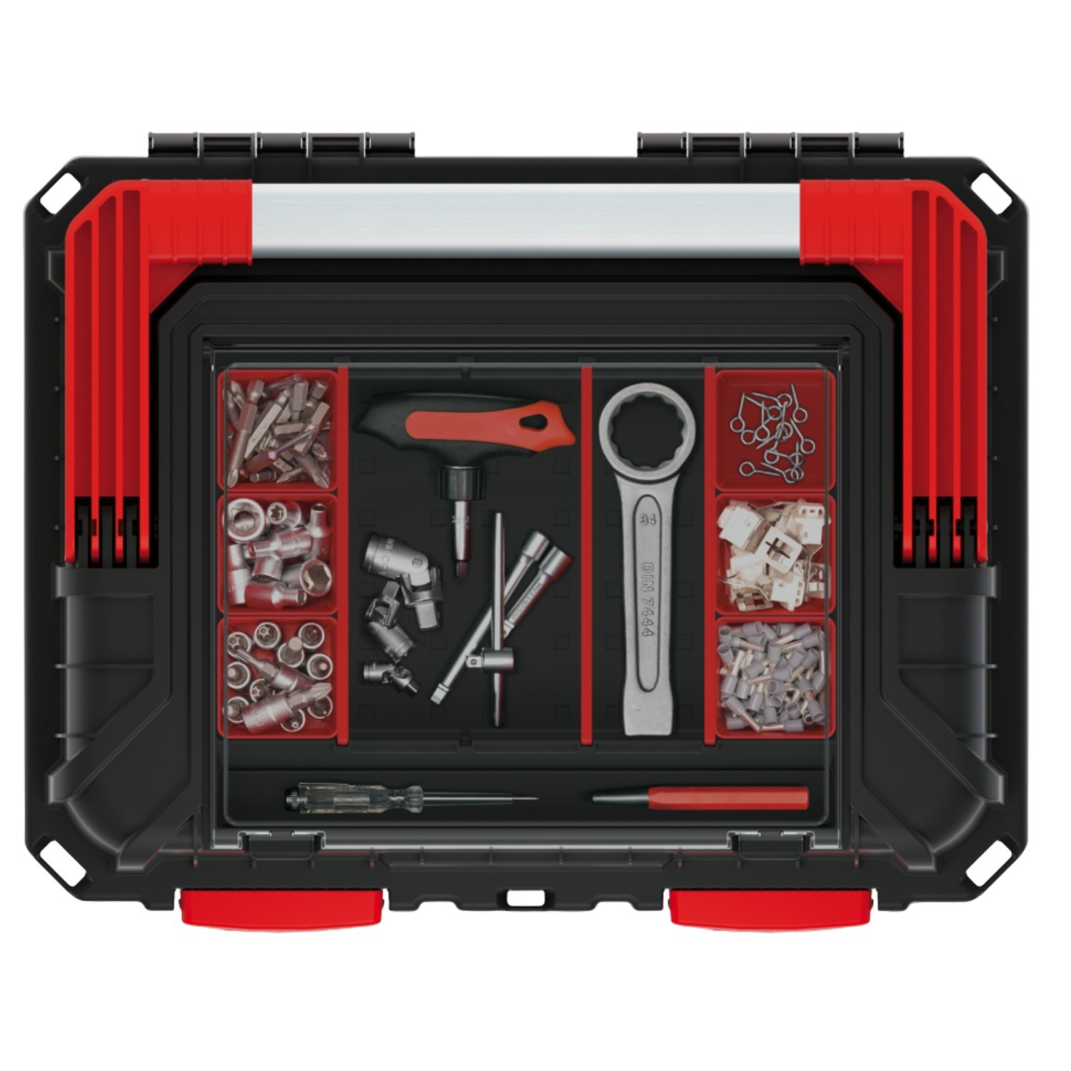 For day-to-day organisation, the lid includes three compartments plus removable cups for screws, bits and small fittings. Inside, a deep removable tray keeps frequently used tools accessible, leaving the main compartment free for larger hand tools.