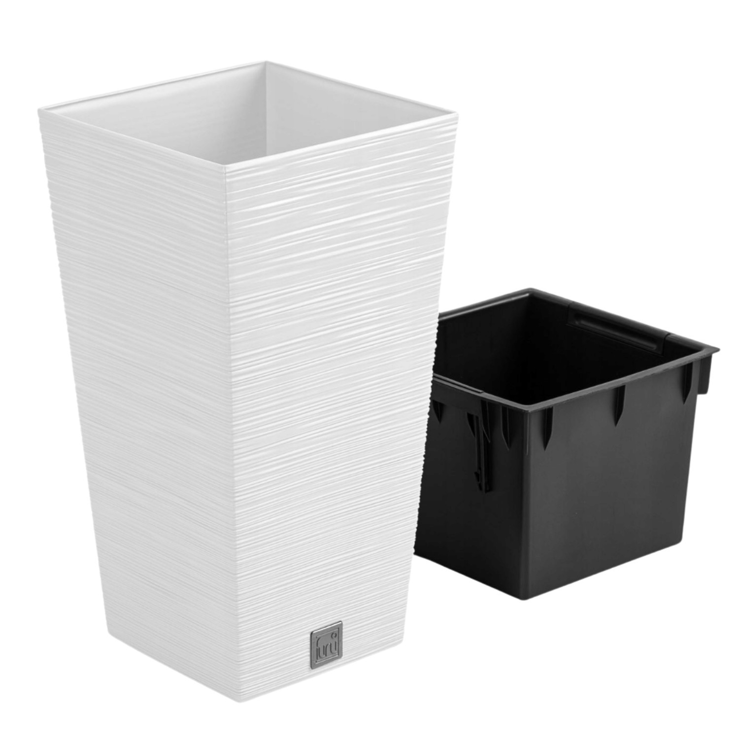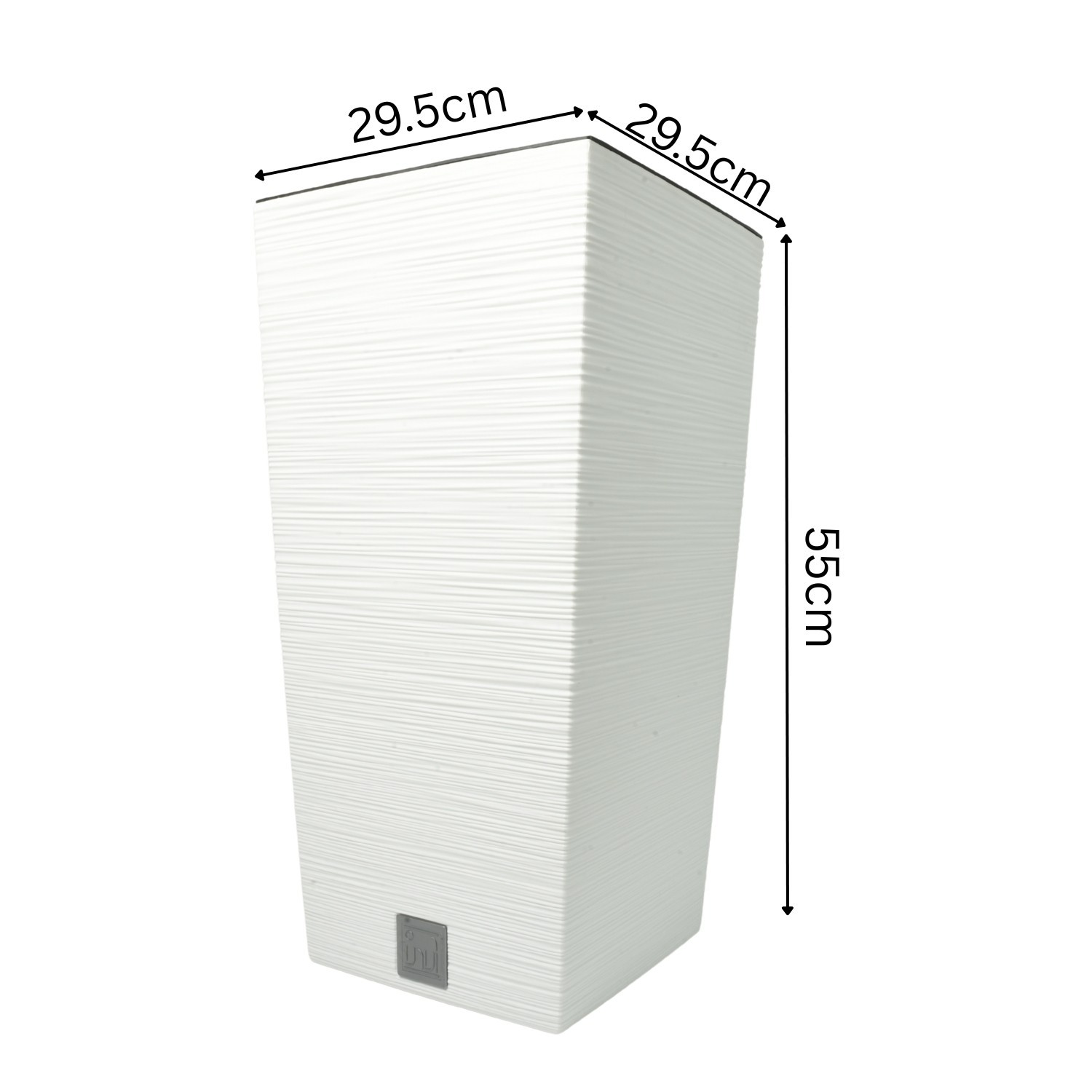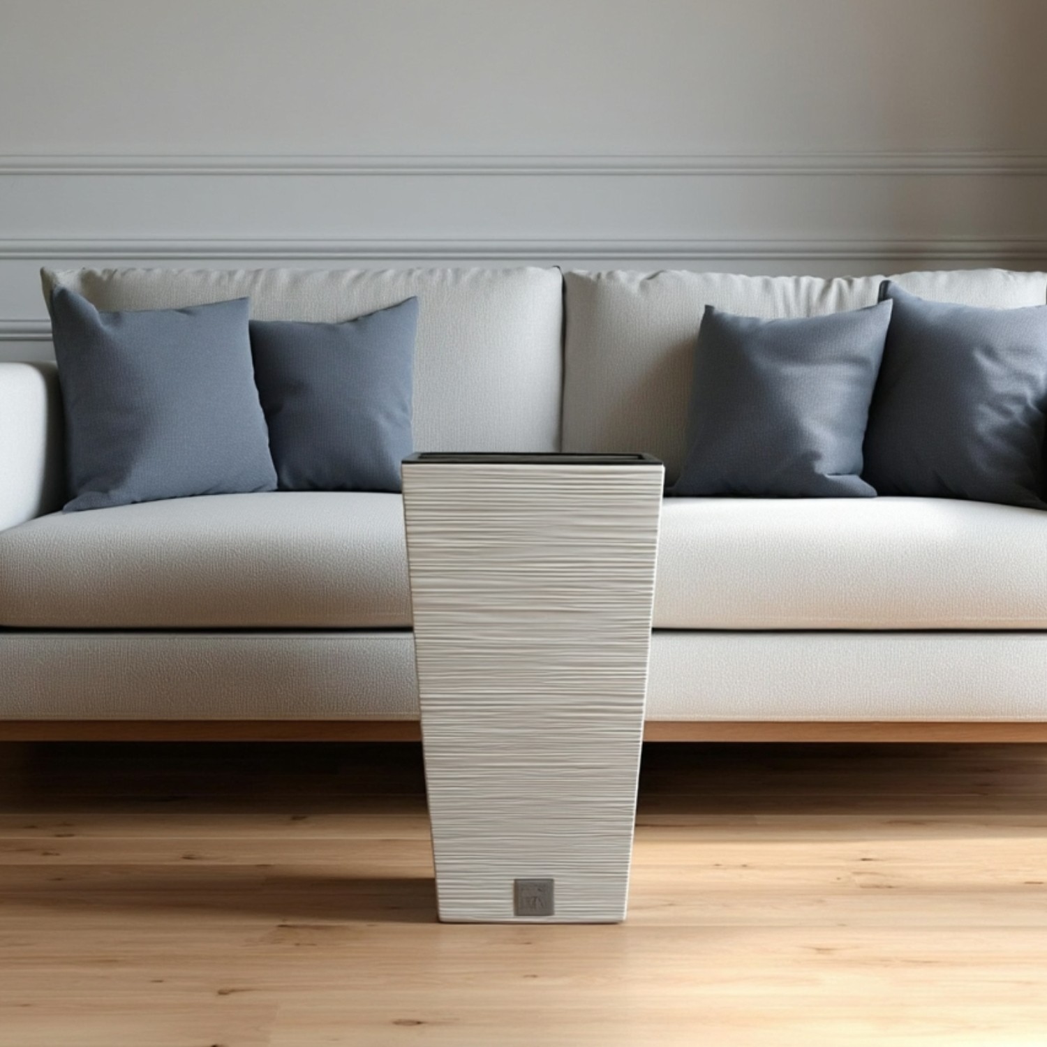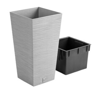 A tall square planter with a textured finish, suitable for indoor or outdoor use. Lightweight and durable, it includes a removable insert to reduce compost use and help keep planting tidy.