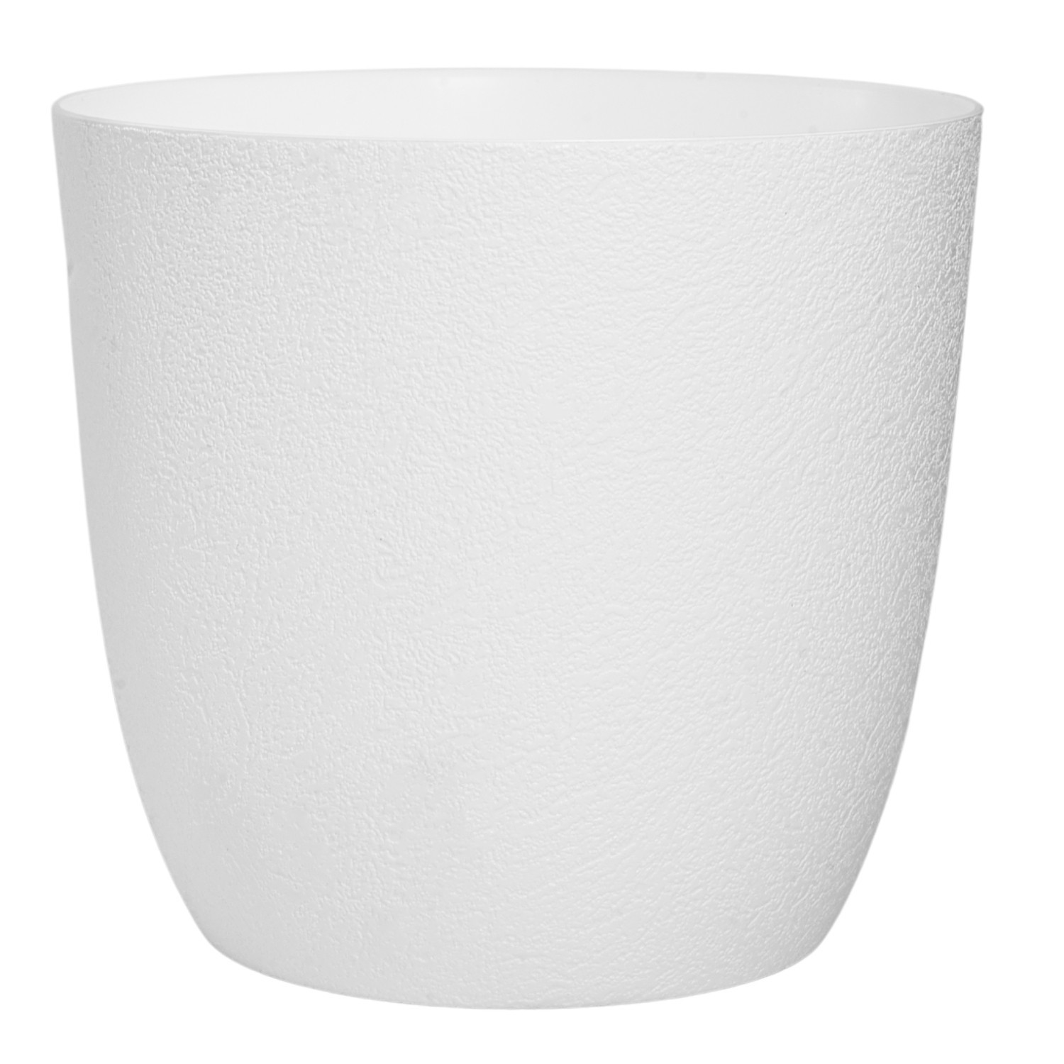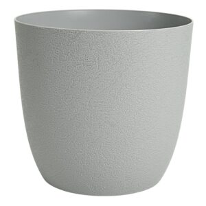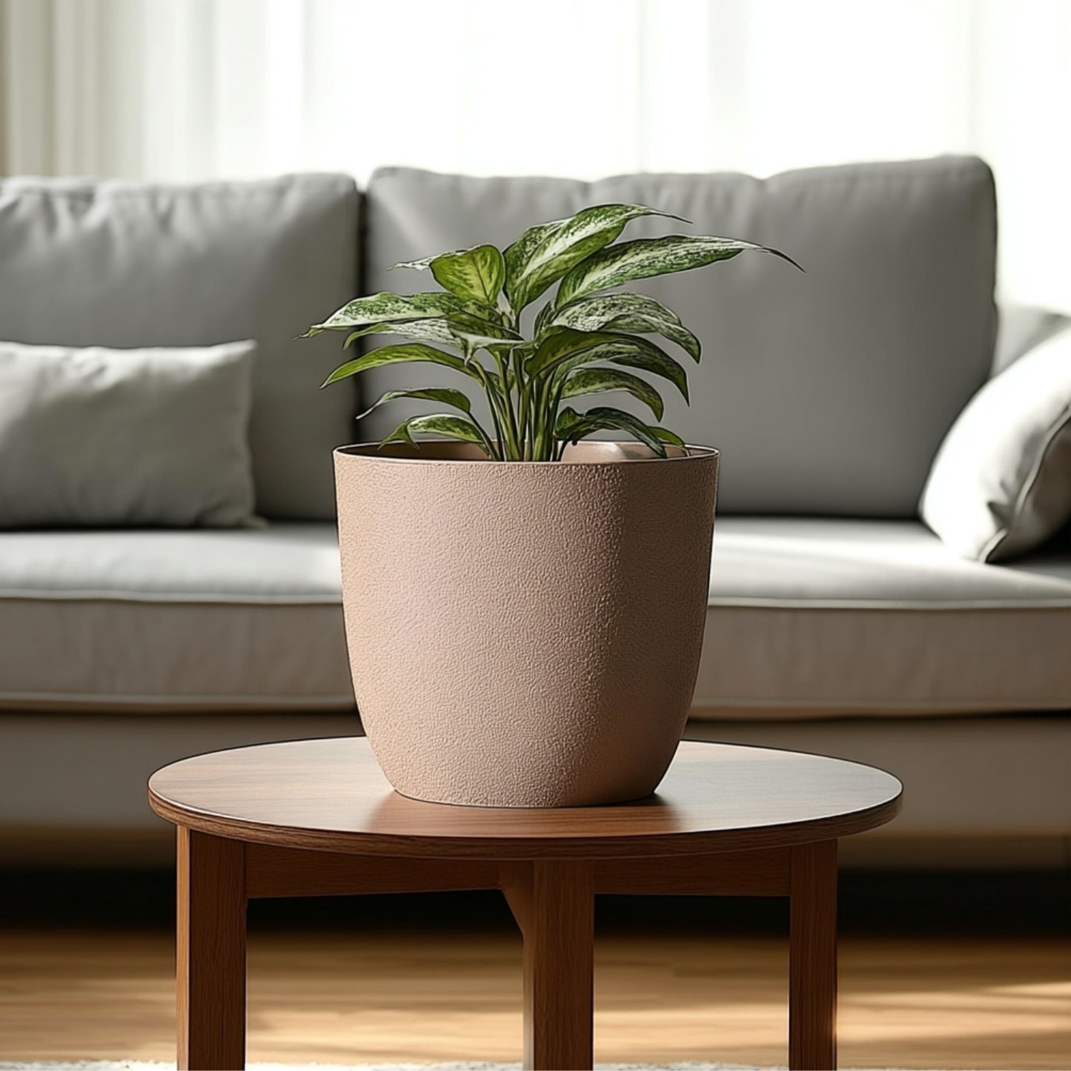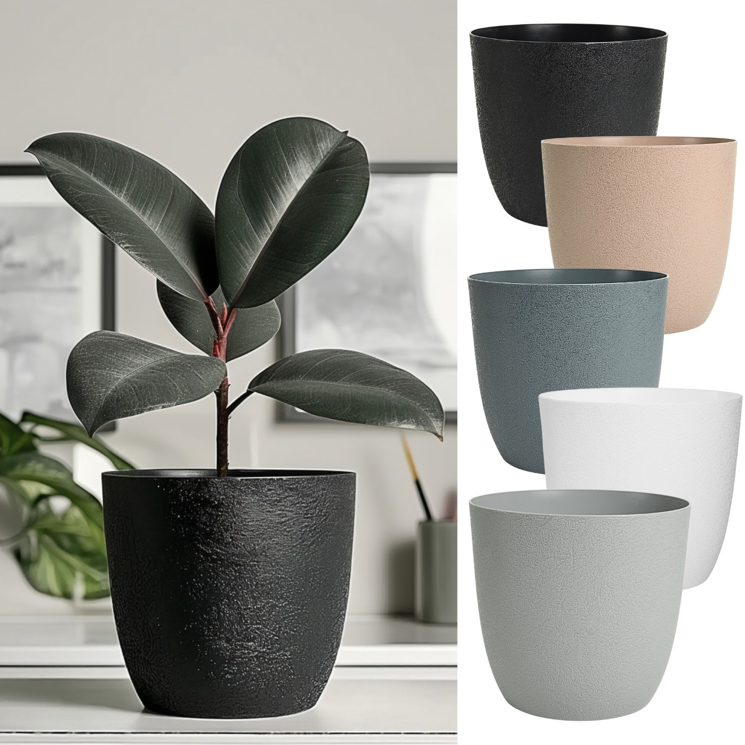 A modern textured round planter made from recycled plastic, with a matte stone-effect finish that suits any room, patio or balcony. Lightweight yet sturdy, it’s weather-resistant and UV-stable for year-round indoor or outdoor use.