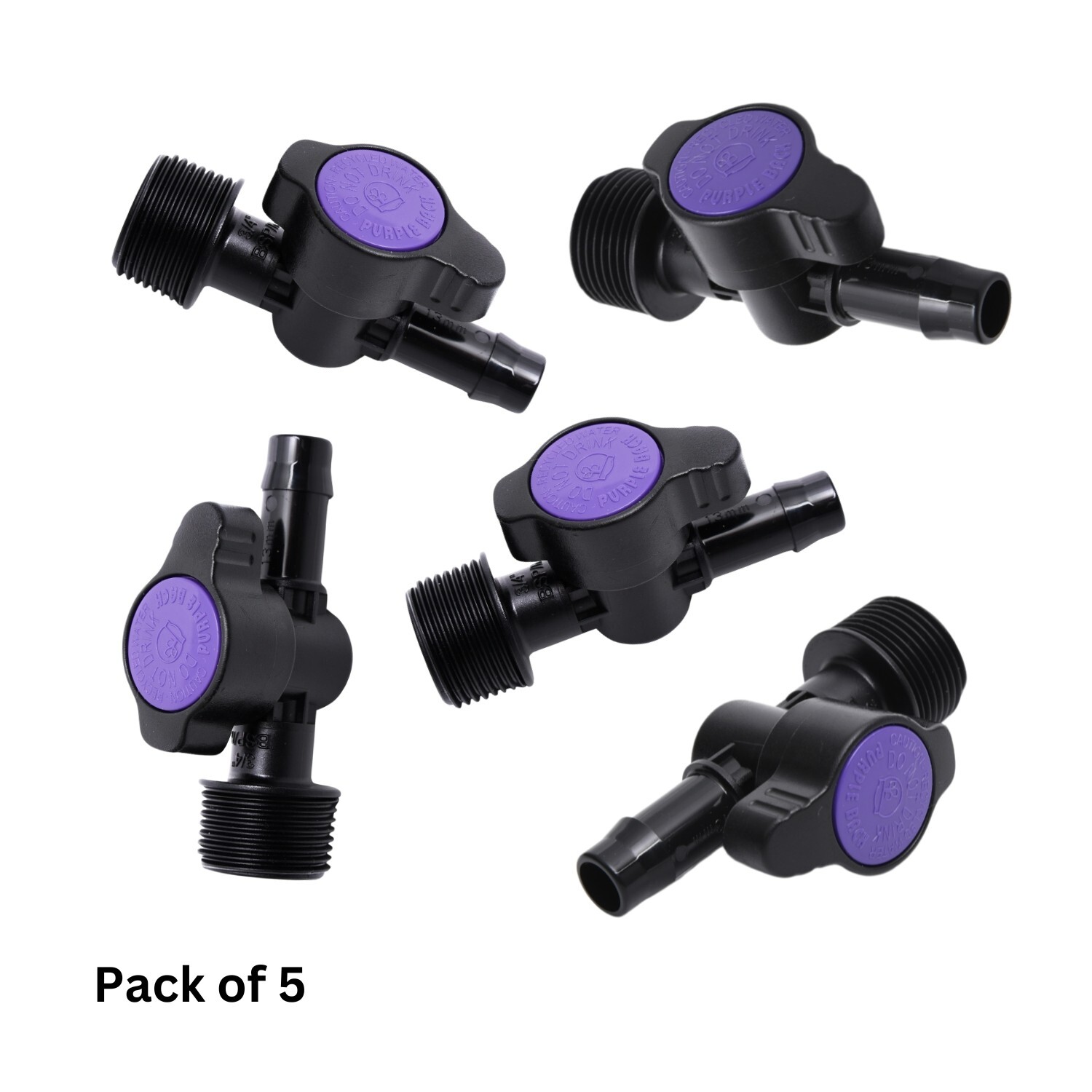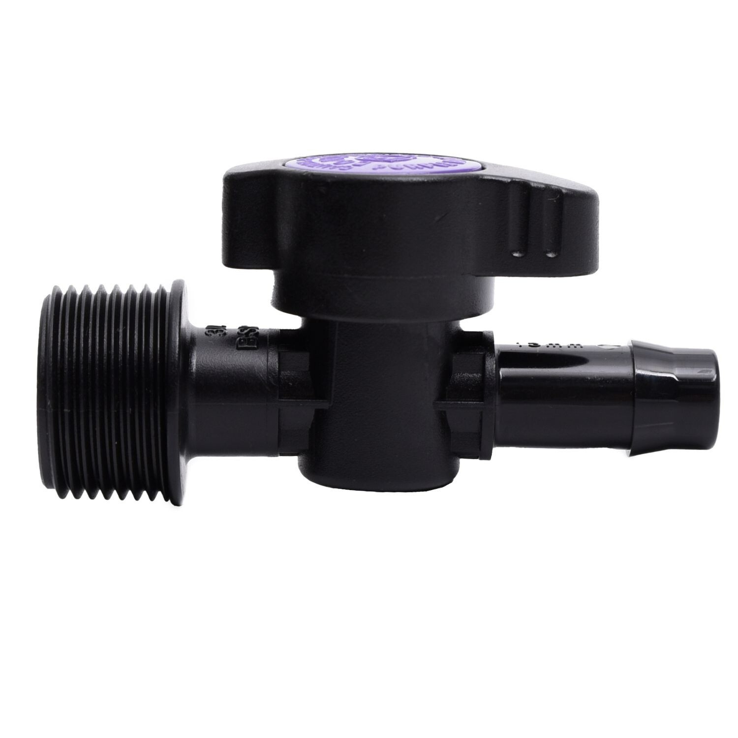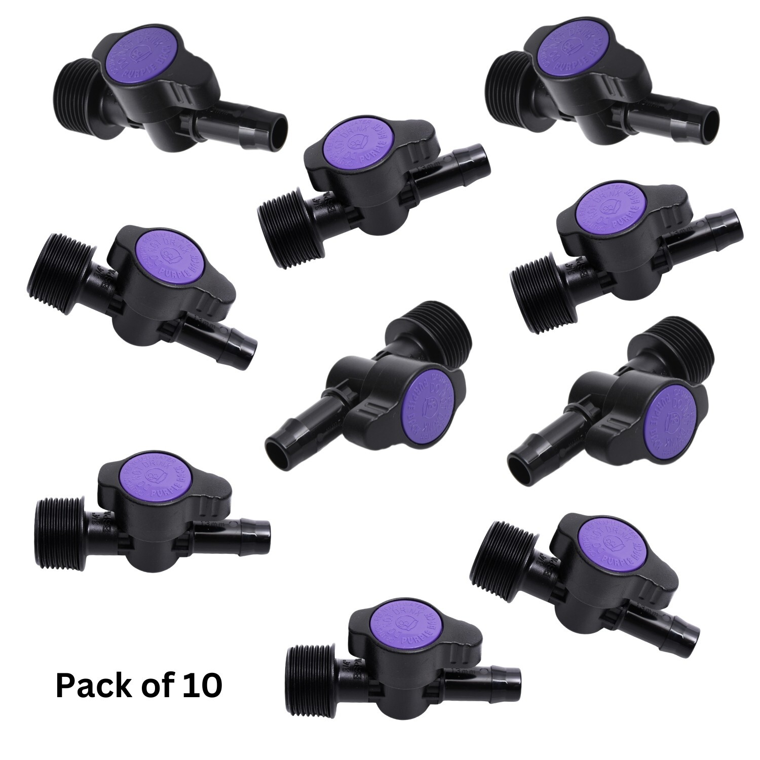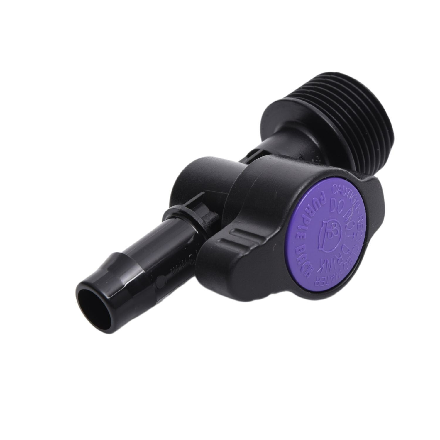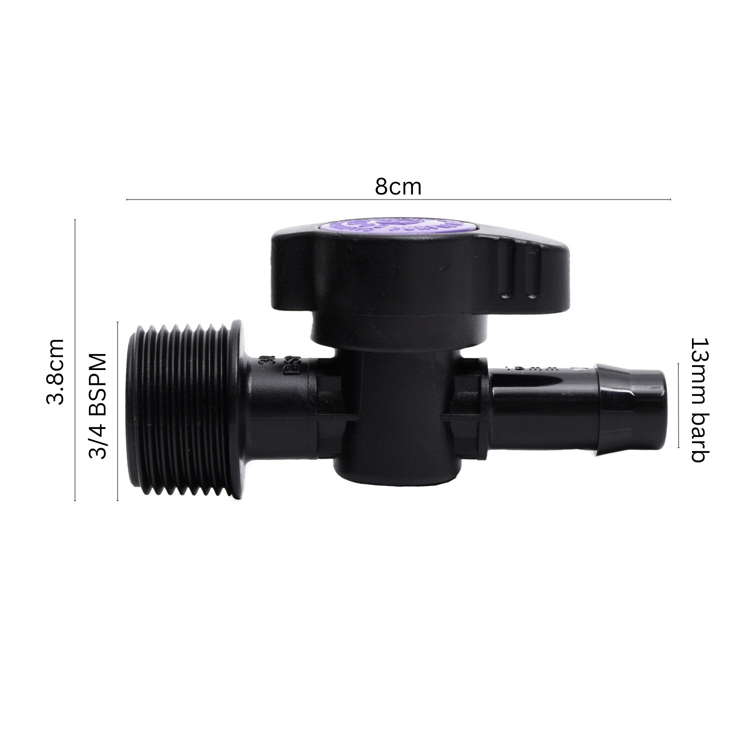 Low-pressure irrigation valve with a 13mm hose barb and 3/4in BSP male thread for simple on/off control. The purple cap helps identify recycled water lines, while the UV-stabilised body is suited to outdoor use.