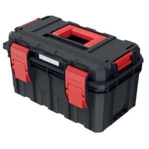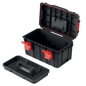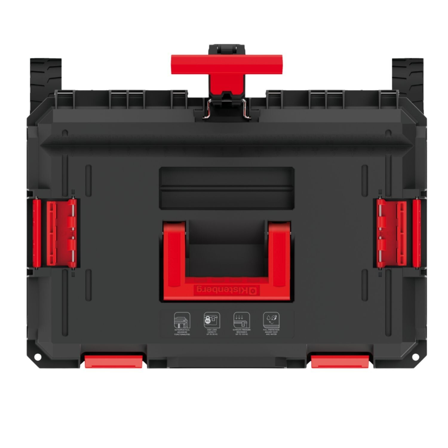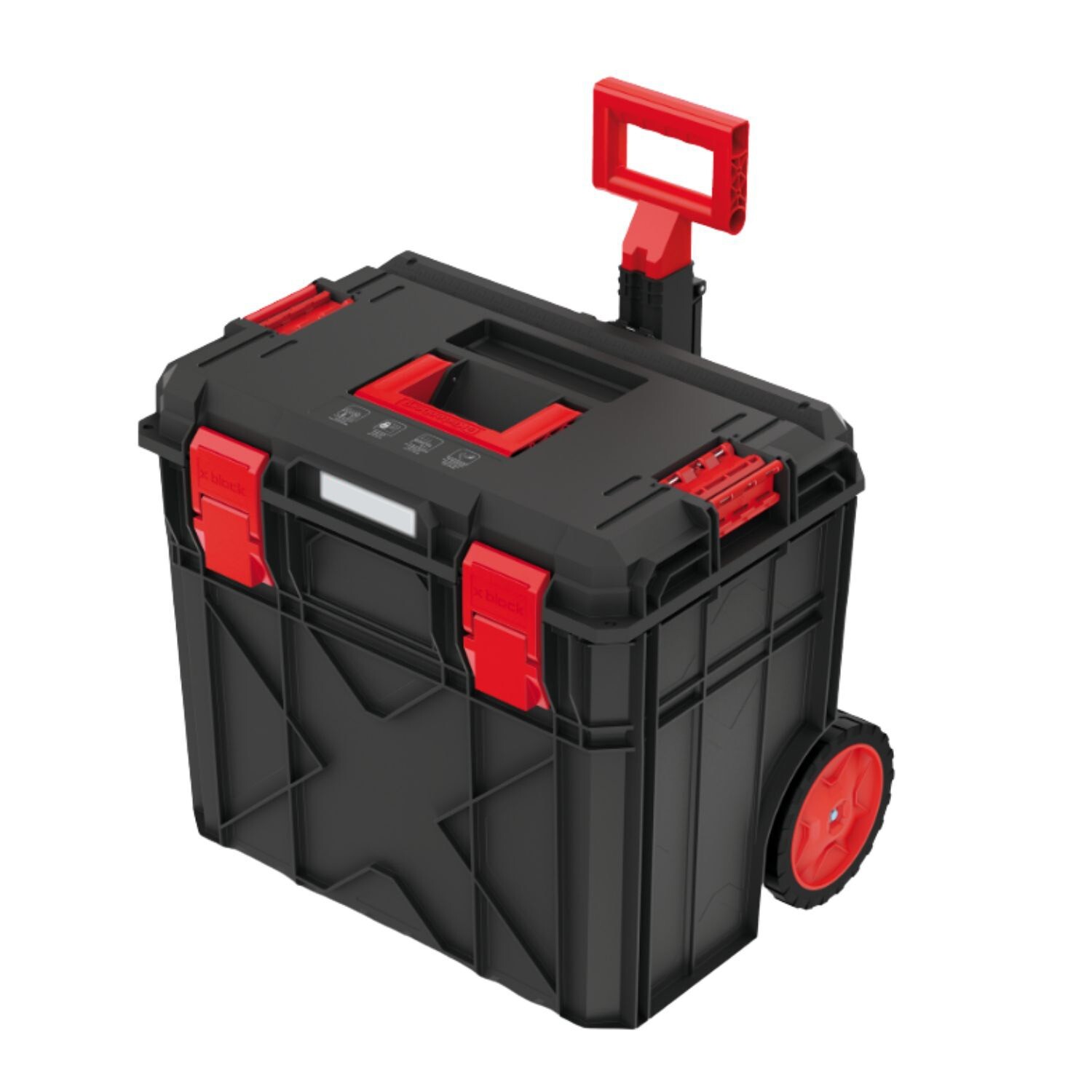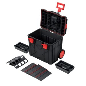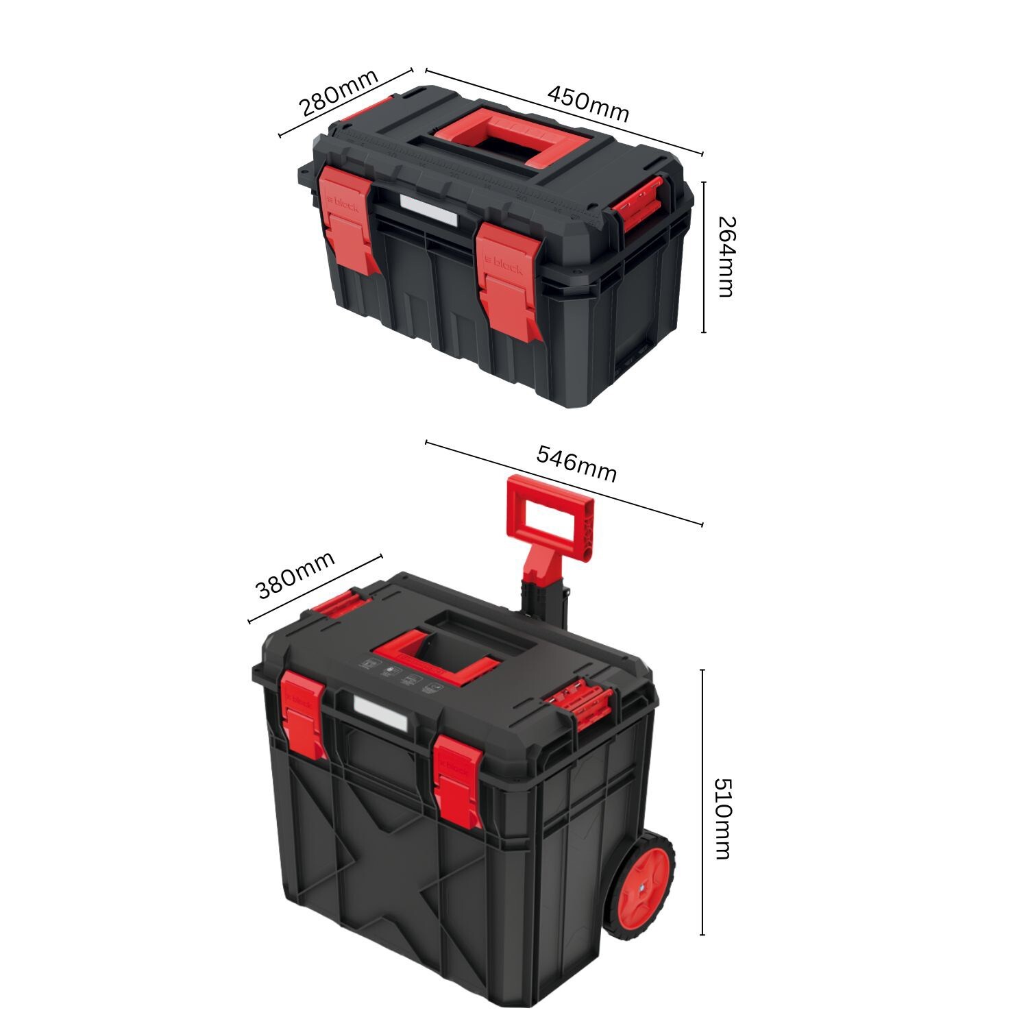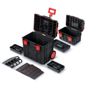 Modular tool storage set with a wheeled trolley and matching tool chest for easy transport and tidy organisation. Built from a tough polymer blend with gasket seals to help keep out dust and water, plus a telescopic handle for moving tools around the job or workshop.