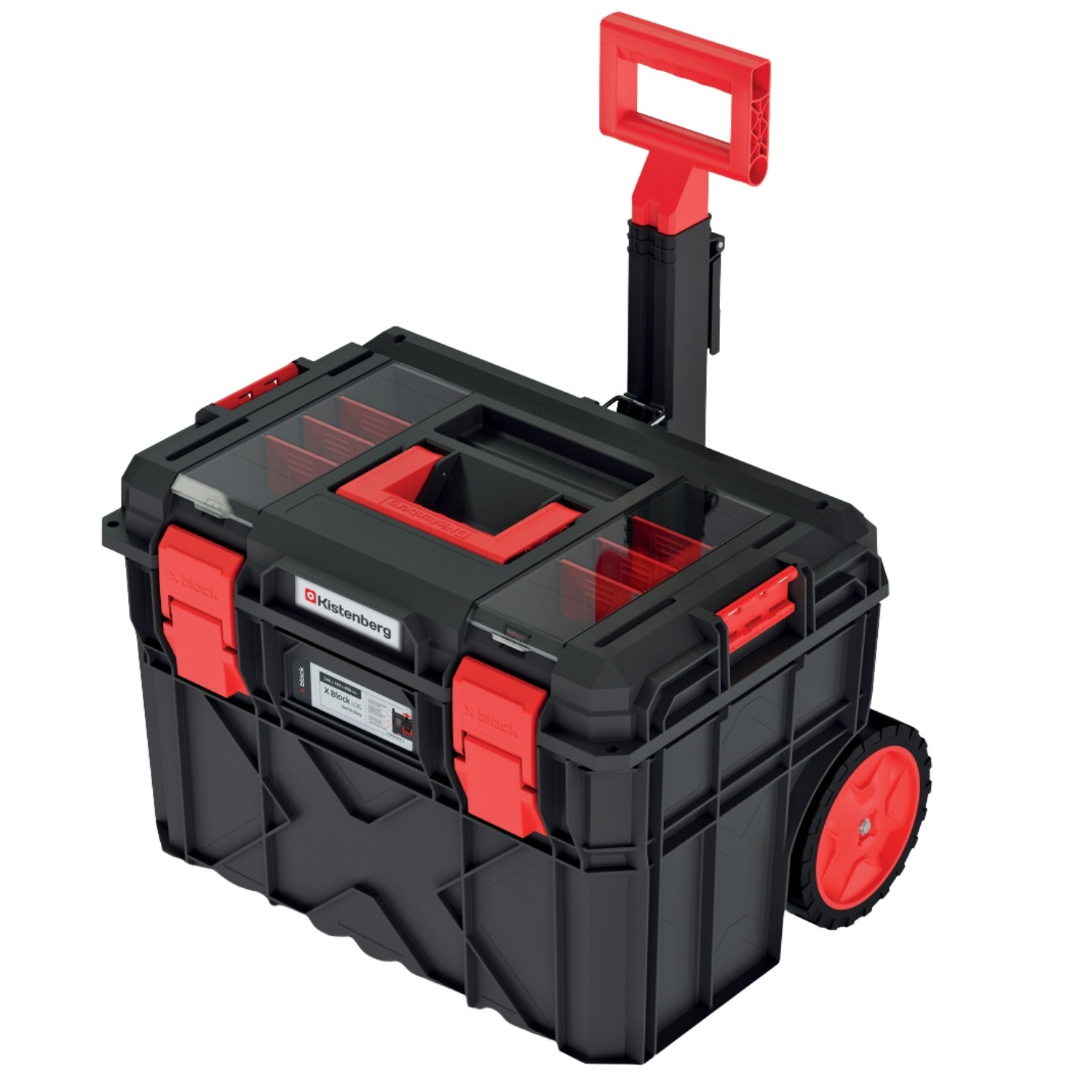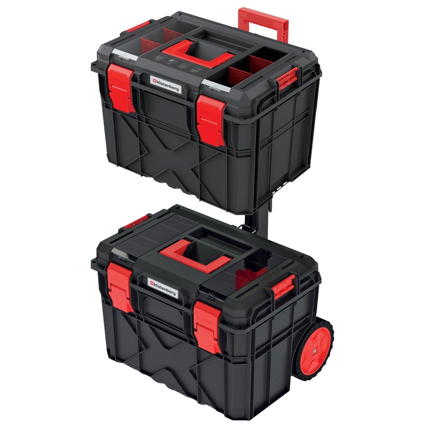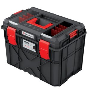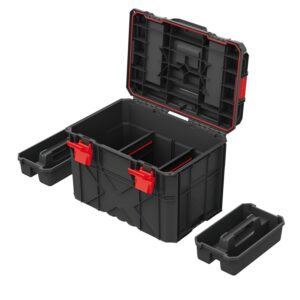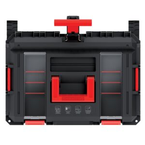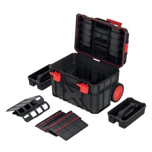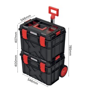 A modular tool storage set with a wheeled bottom trolley and a matching top chest to keep tools organised and easy to transport. Tough polymer construction, clear organiser lids and removable trays make it simple to find parts fast. Sealed lids help protect contents from dust and splashes.