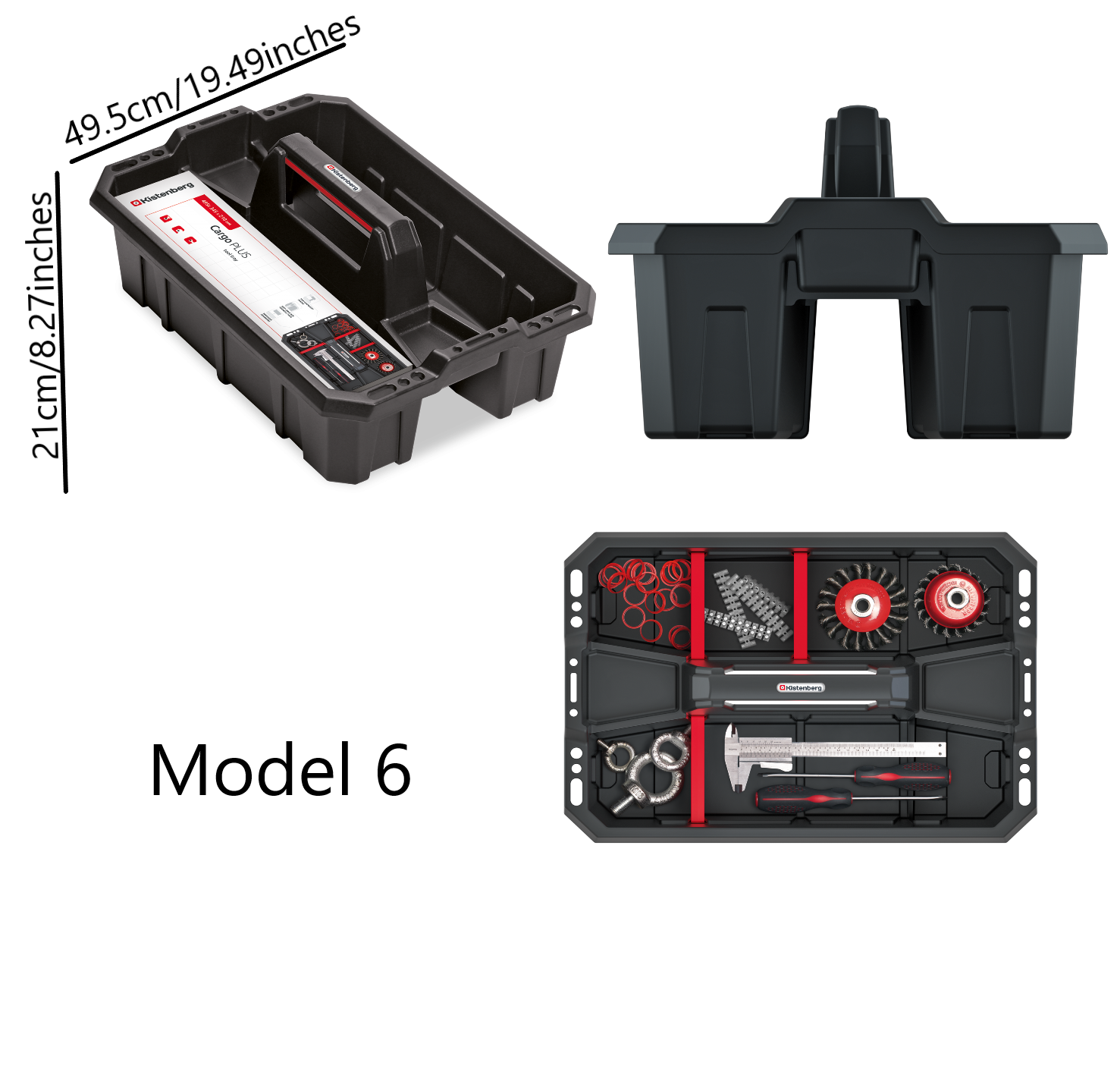 A heavy duty tool tote caddy designed for carrying and organising tools on site or around the home. Deep compartments give quick access and easy sorting, with an ergonomic handle for comfortable transport. Choose from multiple sizes and divider options.