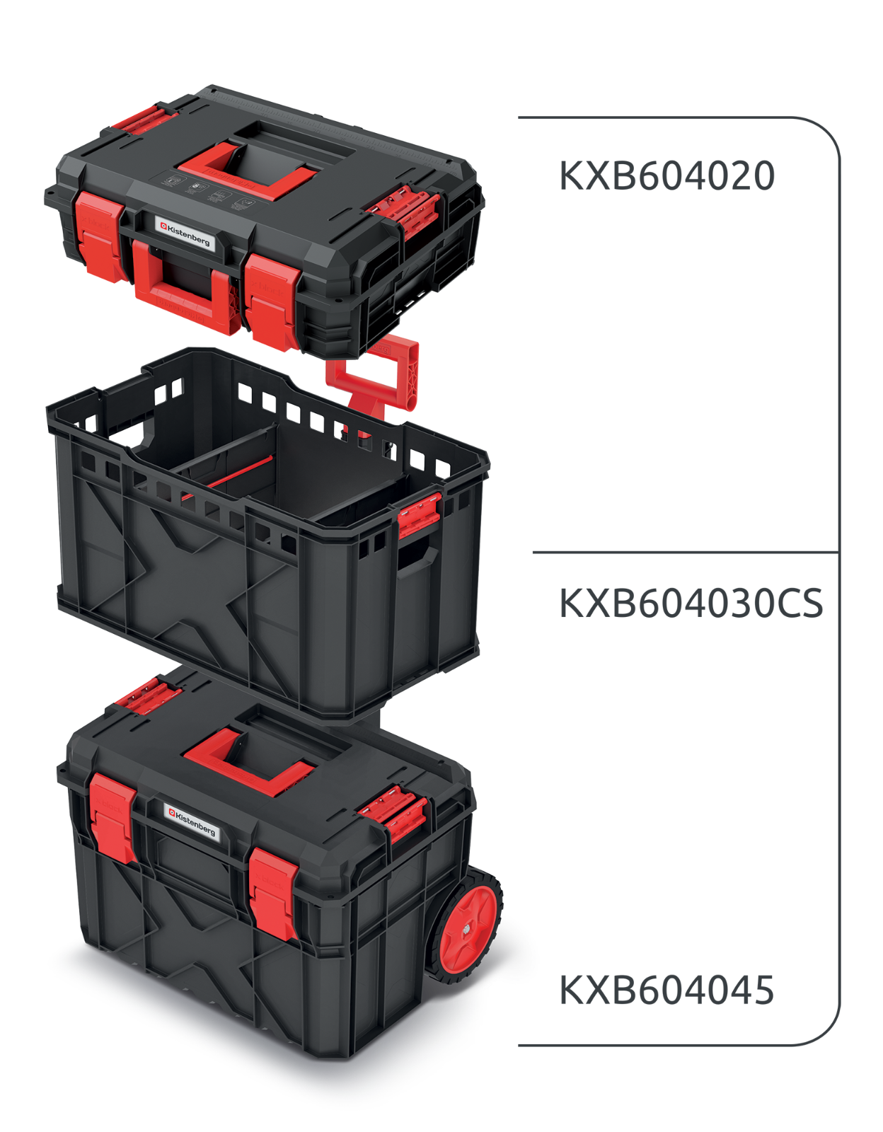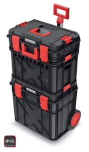 A modular tool storage set that keeps your kit organised and easy to move around the workshop or job site. Includes a wheeled trolley plus stackable storage units with organisers and separators, designed for quick access and protected storage.