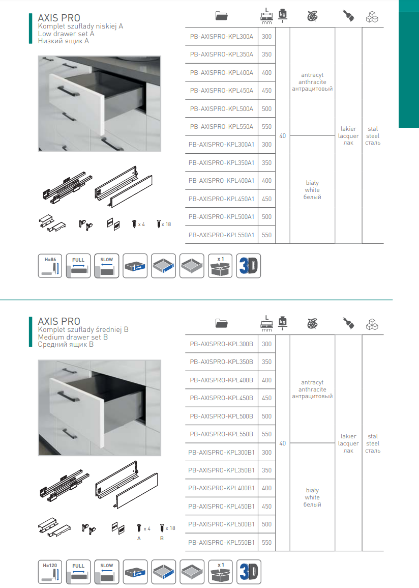 AXIS PRO UltraSlim drawer system with soft-close for smooth, quiet closing and full access to contents. Slim sides maximise usable space while the synchronised runners keep movement steady. Ideal for modern kitchen drawers where durability matters.