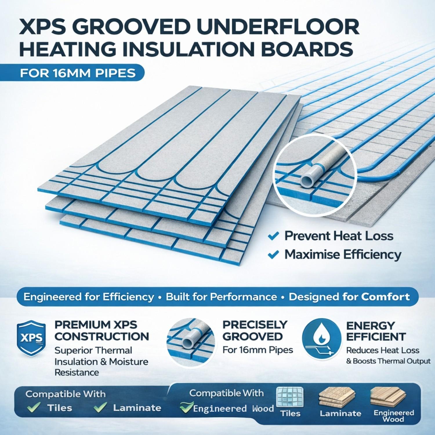 Upgrade your water underfloor heating system with high-performance XPS grooved insulation boards, designed to deliver superior thermal efficiency, consistent heat distribution, and long-lasting performance. Engineered for use with 16mm pipes, these precision-cut panels help maximise system output while reducing energy loss to the subfloor.