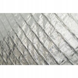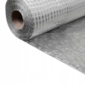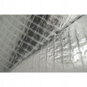 The membrane is made from polyethylene foil with an internal polypropylene mesh reinforcement to improve durability and tear resistance during fitting. An aluminium-faced layer provides a reflective surface to help reduce radiant heat loss, supporting overall insulation performance.