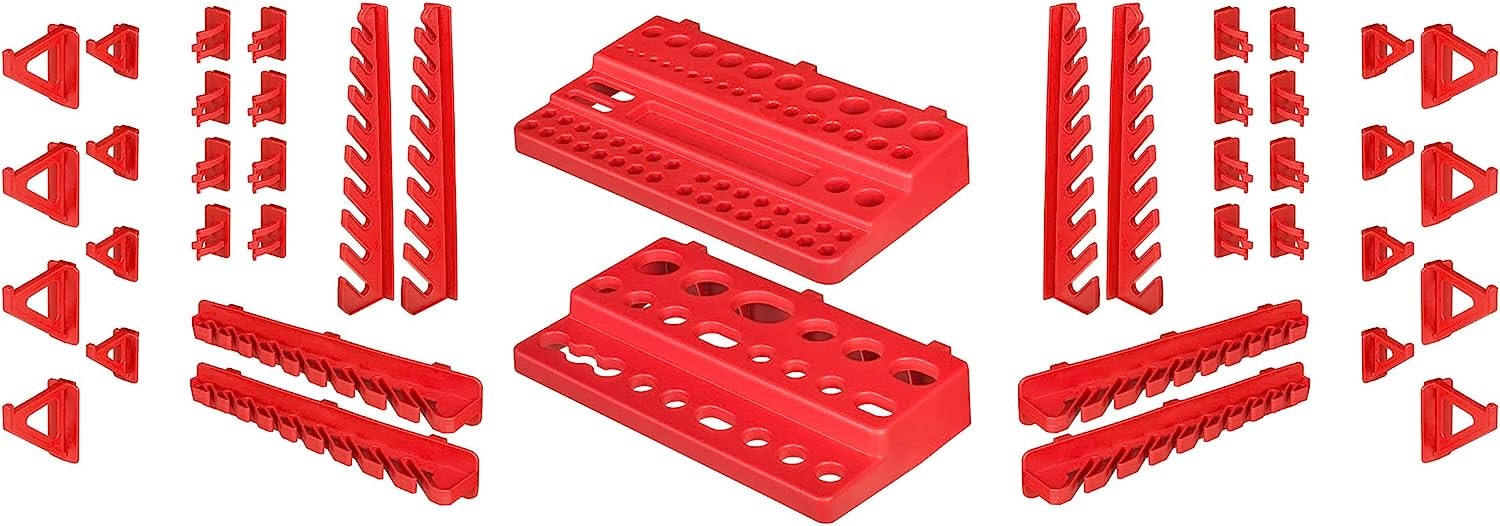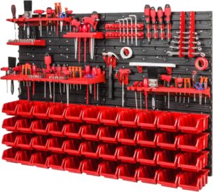 Ideal for garages, workshops and sheds, the perforated board accepts the included holders and hooks so you can hang hand tools, drivers and accessories in a layout that suits your workflow. The small storage bins are useful for fixings, connectors, craft items and other loose parts that are easy to misplace.