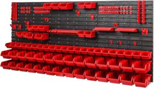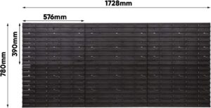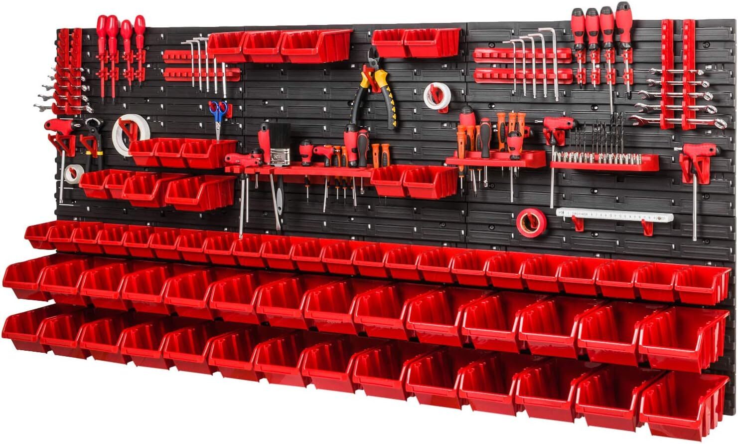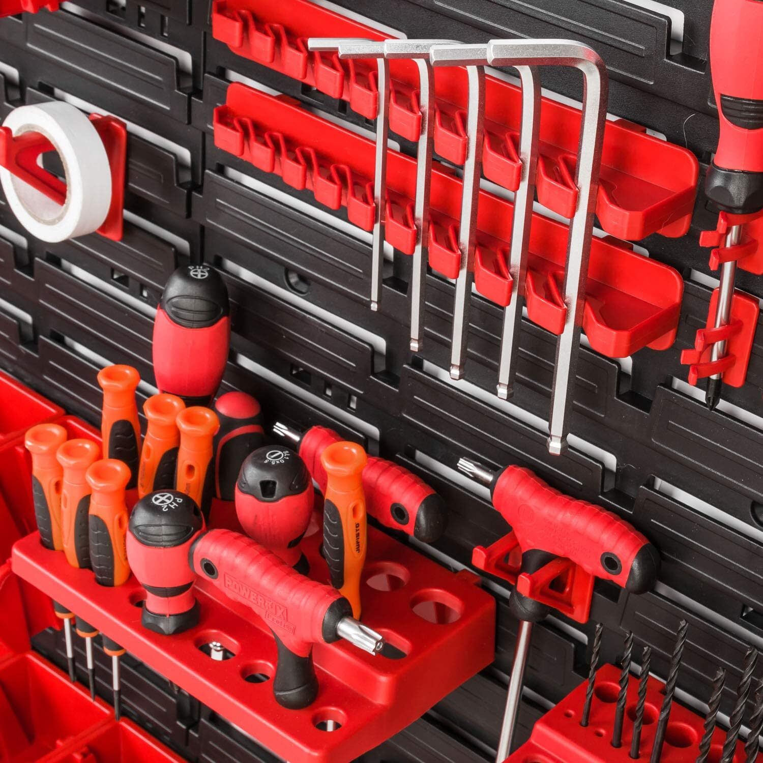 The wall panels and accessories are made from durable polypropylene, chosen for everyday toughness and resistance to scratches and common workshop spills. The perforated panels accept the included holders, hooks and trays, so you can rearrange your setup as your storage needs change.