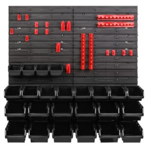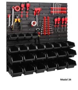 Keep your garage or workshop tidy with this wall-mounted tool pegboard and modular storage bins. The perforated panels let you position holders and hooks where you need them, so tools and small parts stay visible and easy to reach.