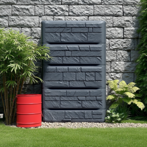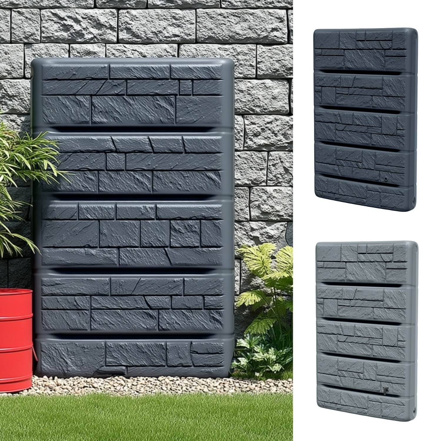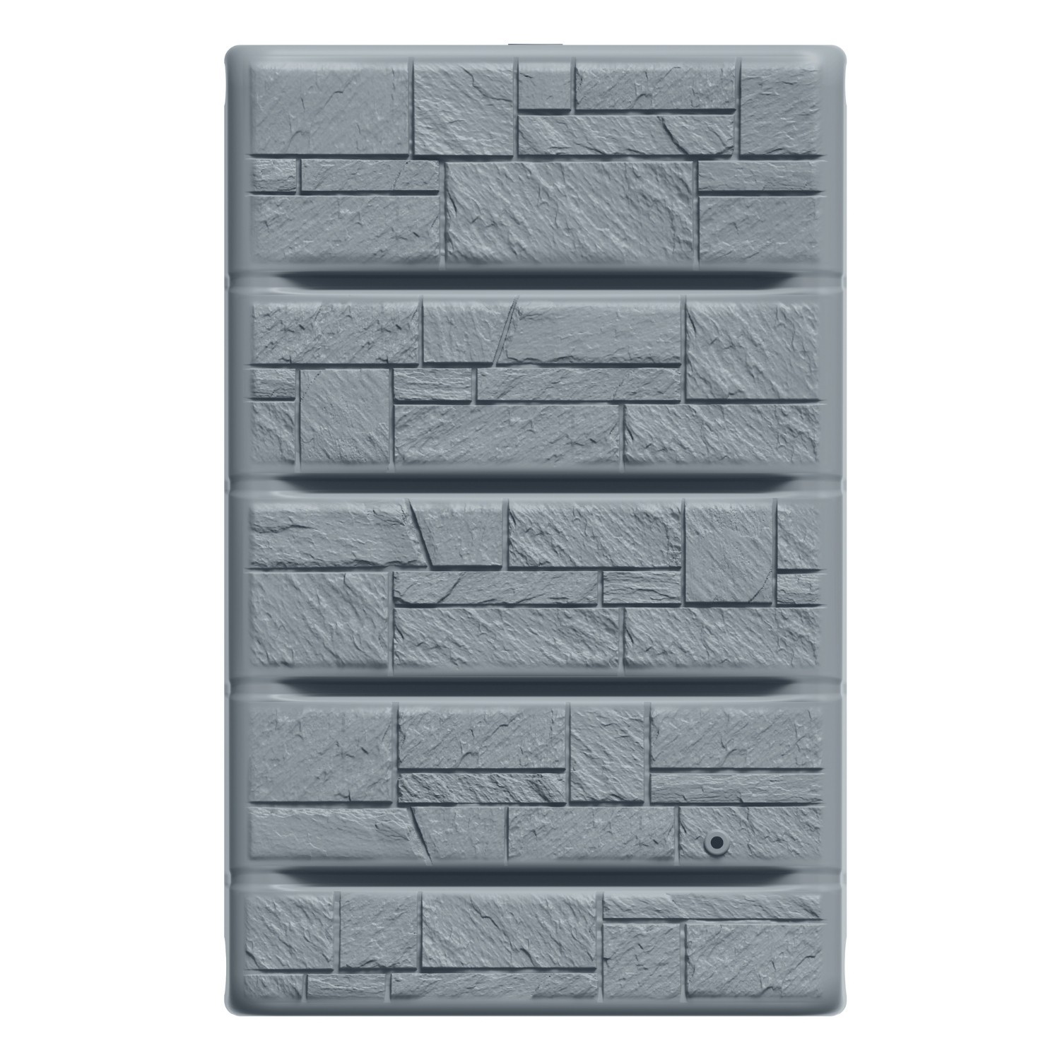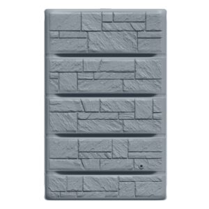 The tank is made from durable, weather-resistant plastic with a segmented construction for added stability. A decorative stone-effect front panel gives a tidy, modern look, and two threaded outlet points allow you to fit a tap or a quick-release coupling for convenient access to stored water.