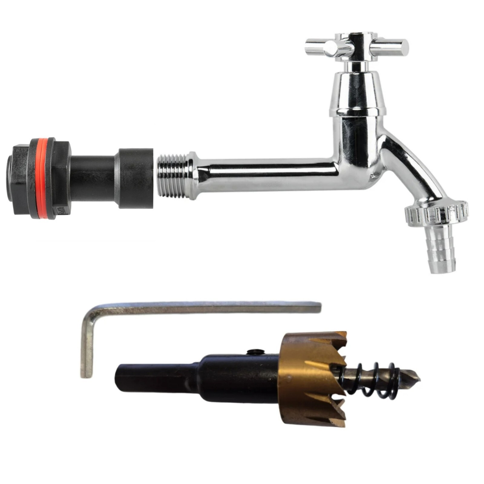 The kit combines an extension connector with a tap option of your choice, helping you reach past thicker tank walls and position the outlet comfortably. Washers and a securing nut are used to create a watertight seal, while the included HSS drill bit helps you prepare a neat hole for installation.