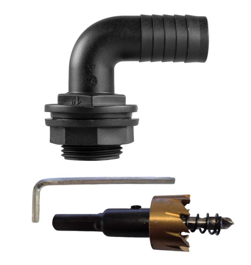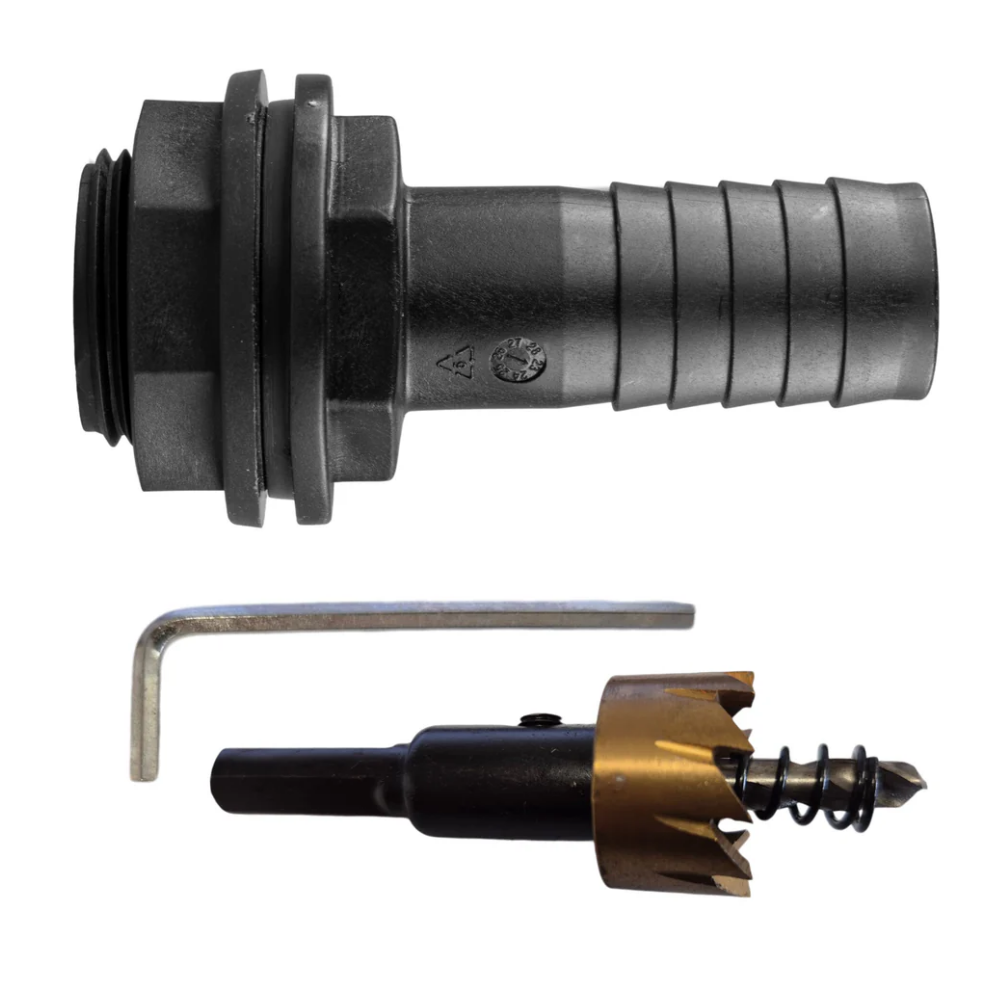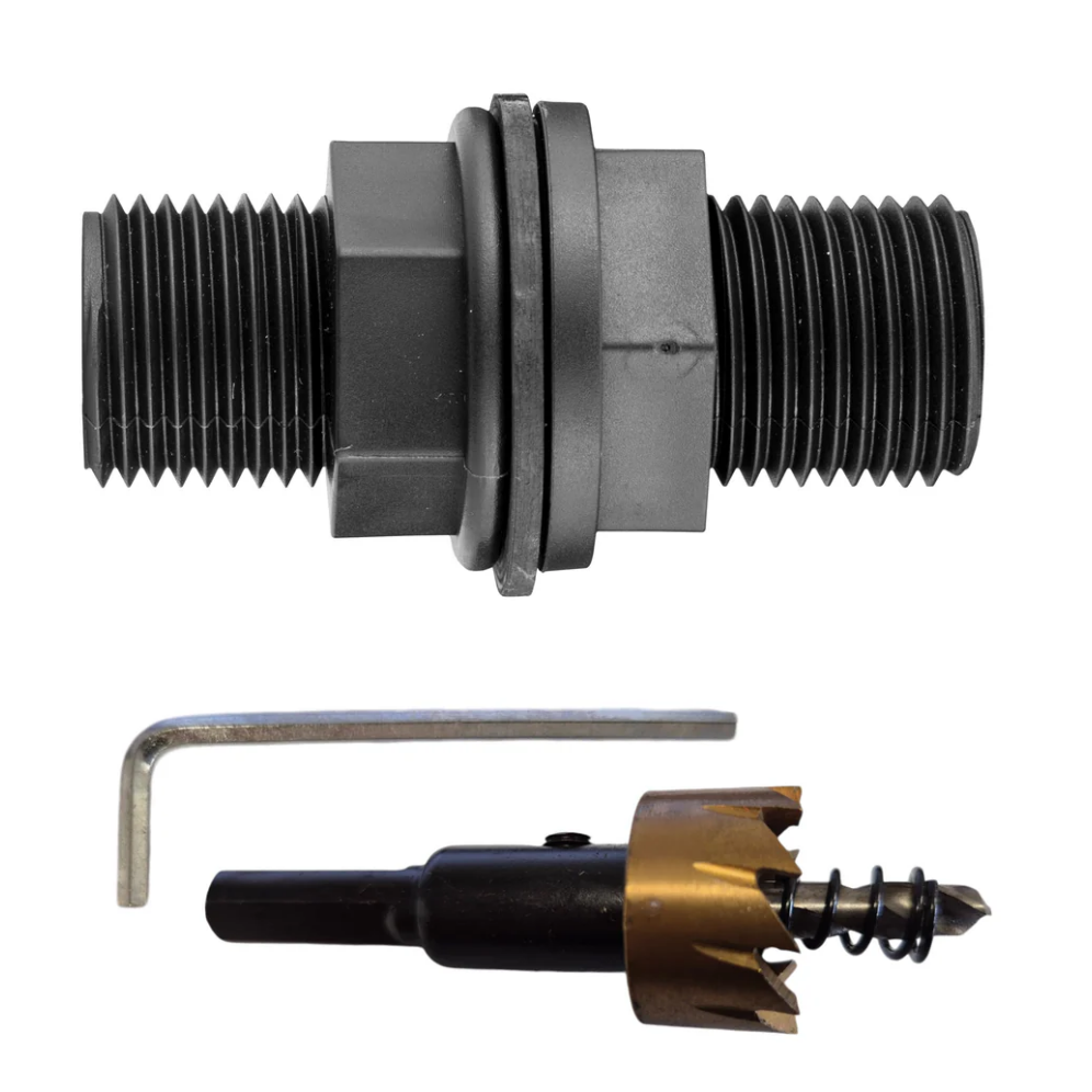 Each variant pairs a durable connector with a matching hole saw to help you make an accurately sized opening in the tank wall. The connector is made for outdoor use and is suited to typical above-ground rainwater storage and garden watering arrangements.