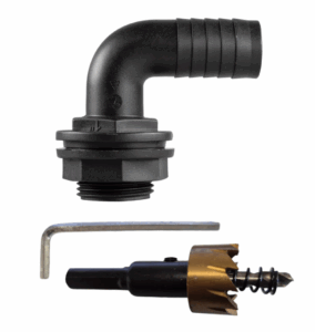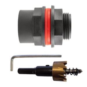 To install, mark the hole position, drill using the supplied hole saw, then fit and tighten the connector following your tank and fitting guidance.