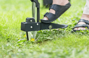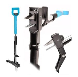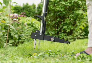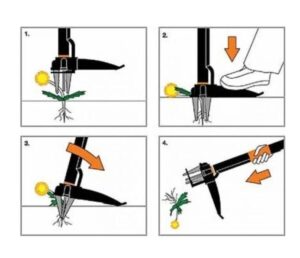 The tool features deep-reaching stainless steel claws that grip the root from four sides for a secure hold. An ergonomic D-shaped handle supports a comfortable working position, and the built-in foot platform allows you to press the head into the soil more easily.