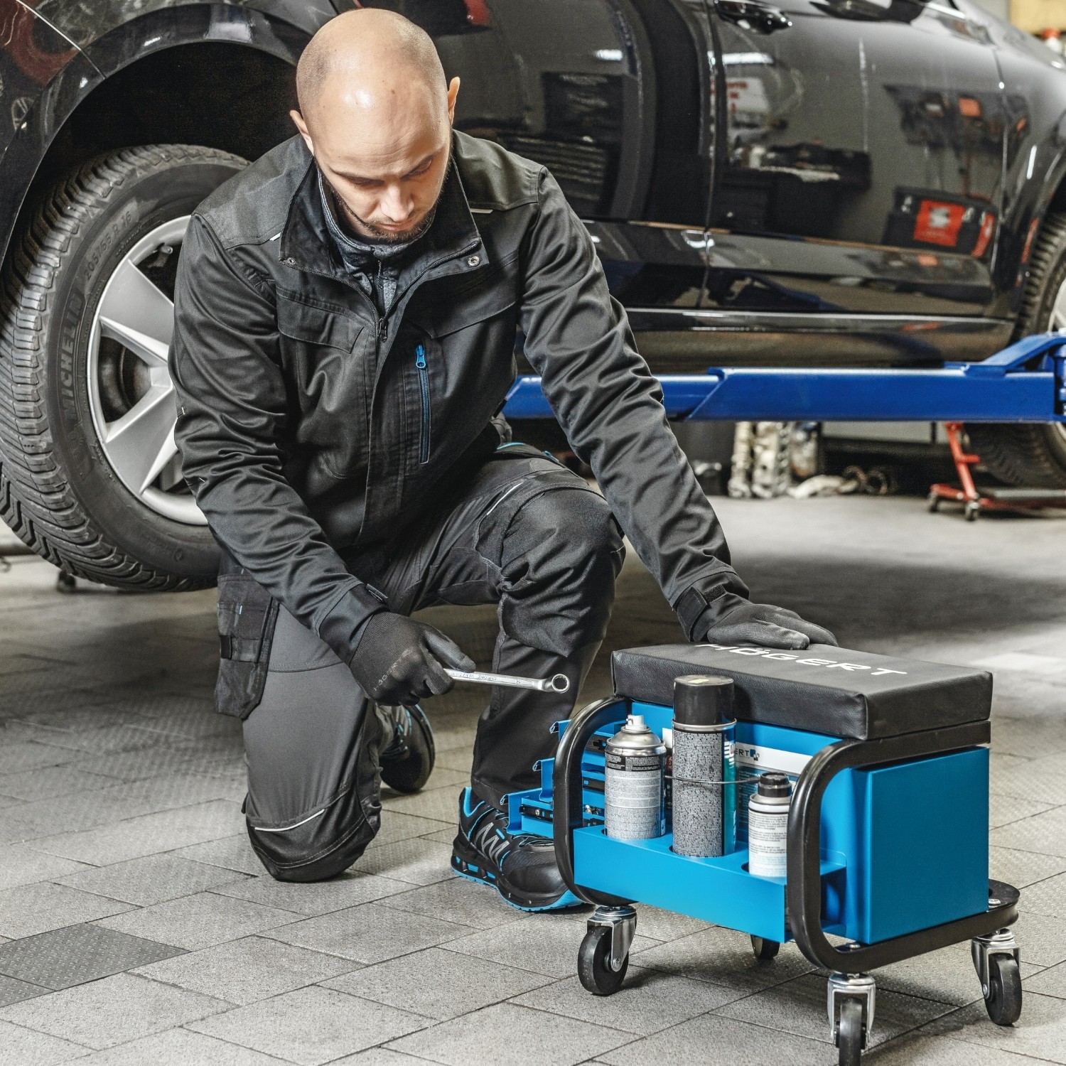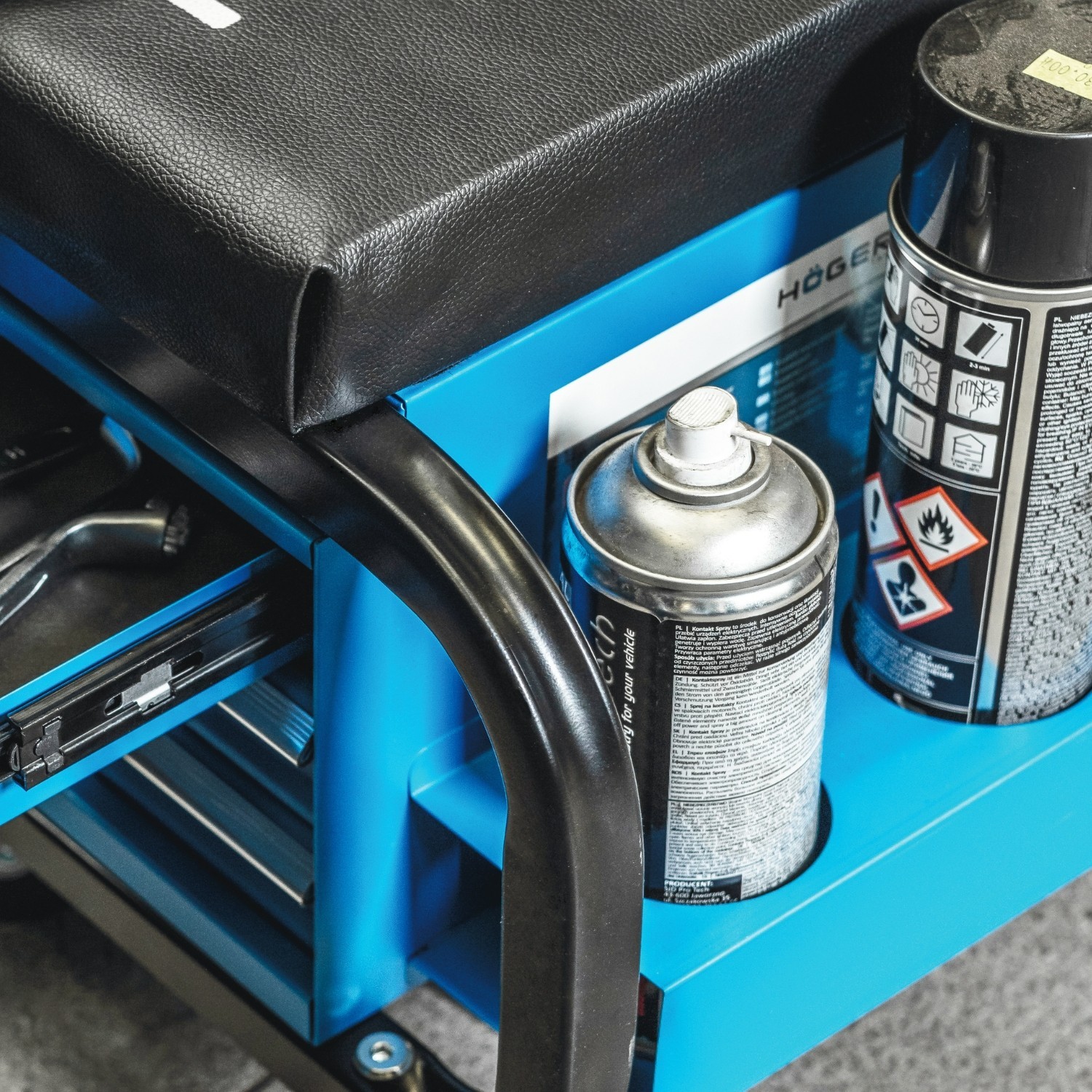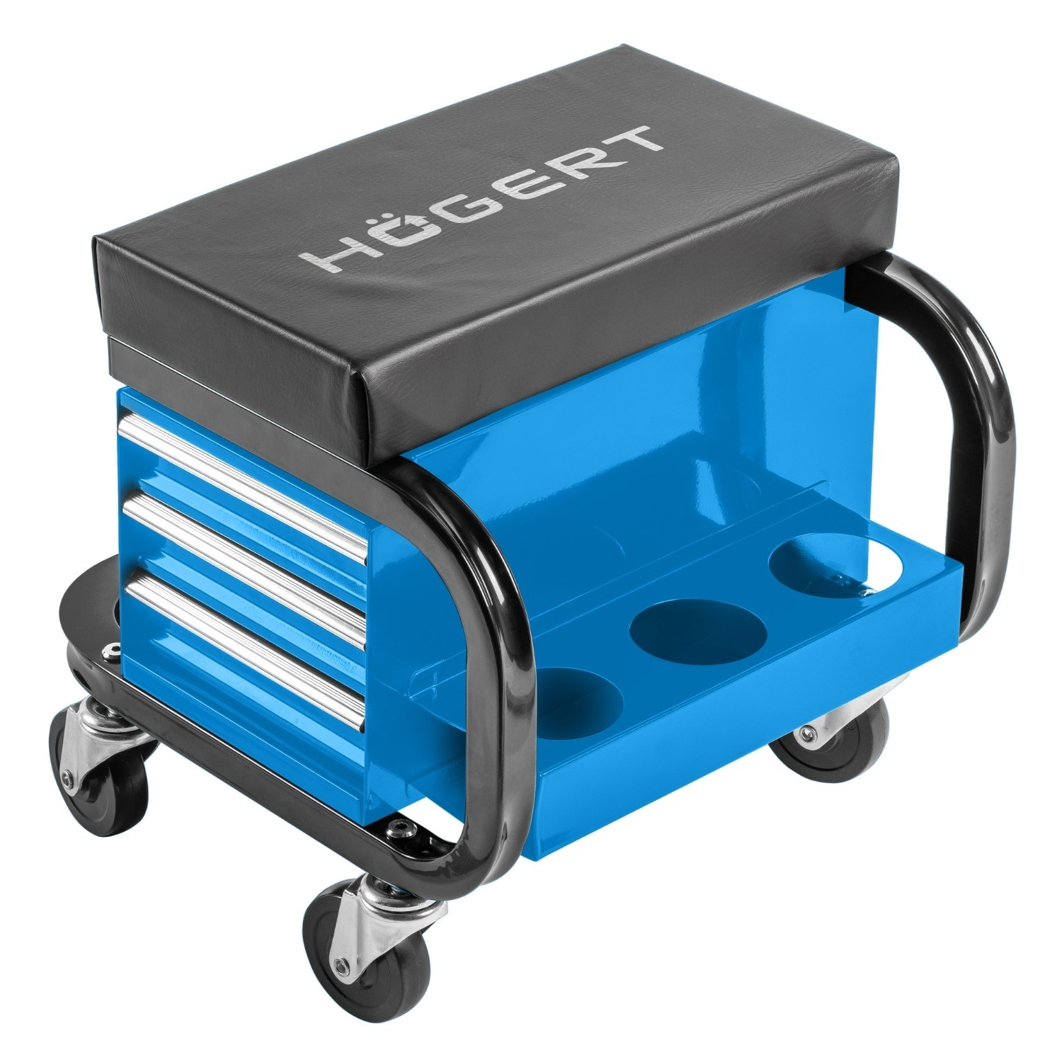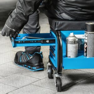 Built around a heavy-duty metal frame, the seat features a foam-padded cushion for improved comfort during longer jobs. Three drawers slide in and out smoothly to store small tools, parts and consumables, and the seat rolls easily on swivel castors for quick repositioning.