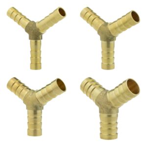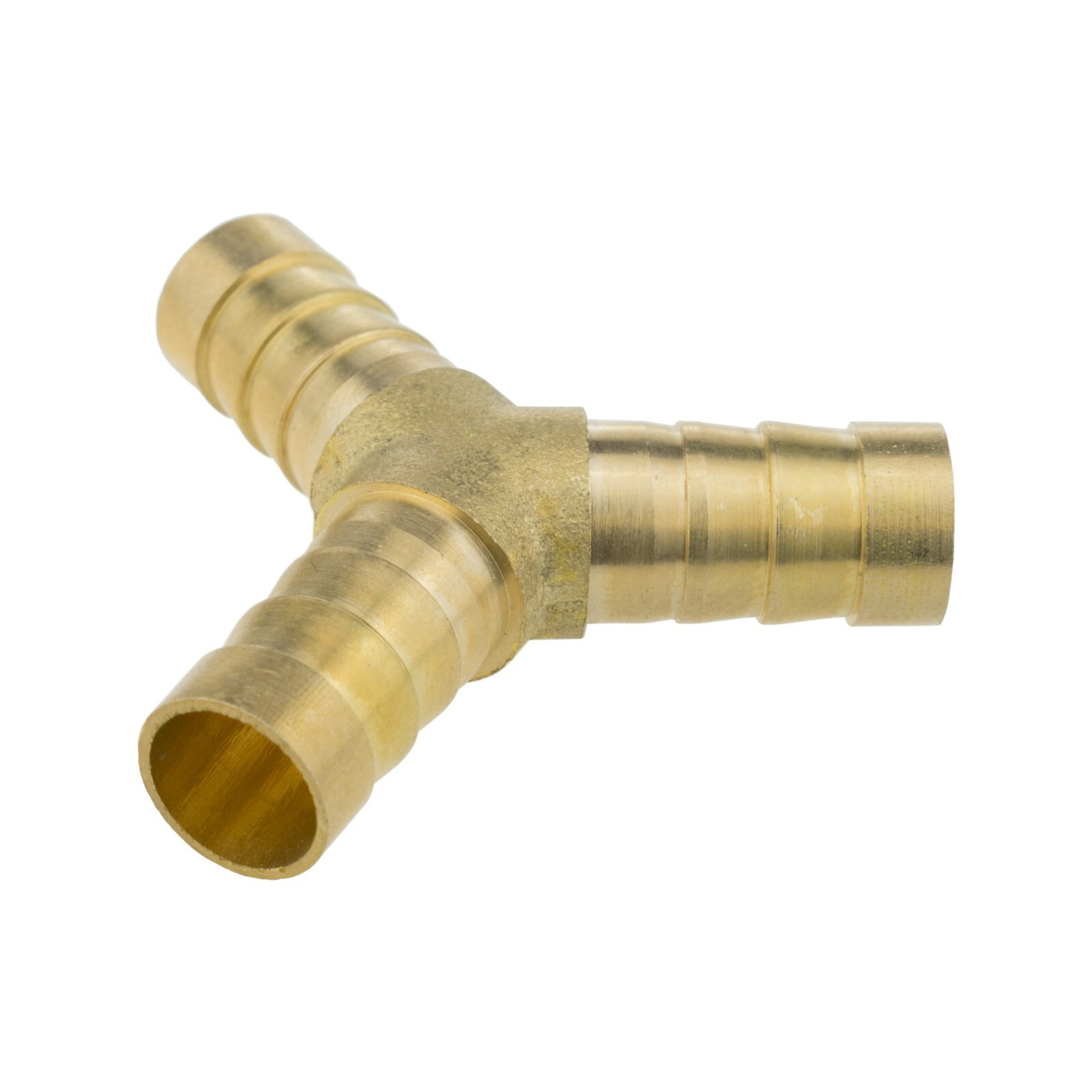 Solid brass Y splitter for branching a hose or tube run into two lines. Barbed hose tails grip securely for a tight, leak-resistant push-fit connection. Suitable for air, water and fuel lines in home, garden, automotive and workshop setups.